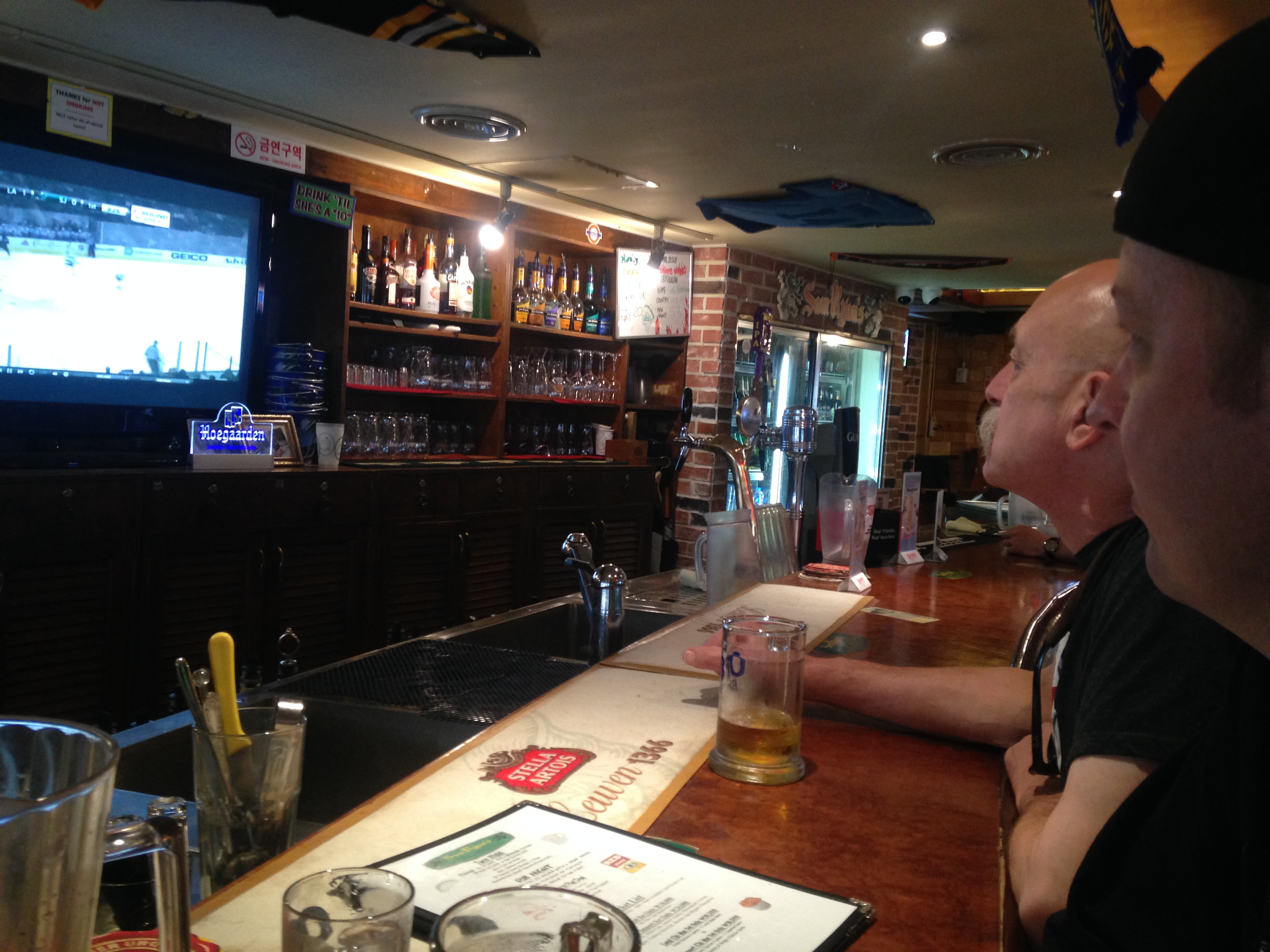 Our third day in Seoul began with a quest for American hockey. The San Jose Sharks were in a playoff match that day; we discovered before we left the states that Sam Ryan’s in Itaewon was the place to go for American sports. We took a cab there and went searching for the bar using instructions we got from a blog, which told us to find the KFC by the Itaewon subway stop, make a right, go up the stairs, make a left in the alley, and walk to the end of that street. I think we were also told there was a bus on top of the building. That is literally how you find things in Seoul. With directions like that.