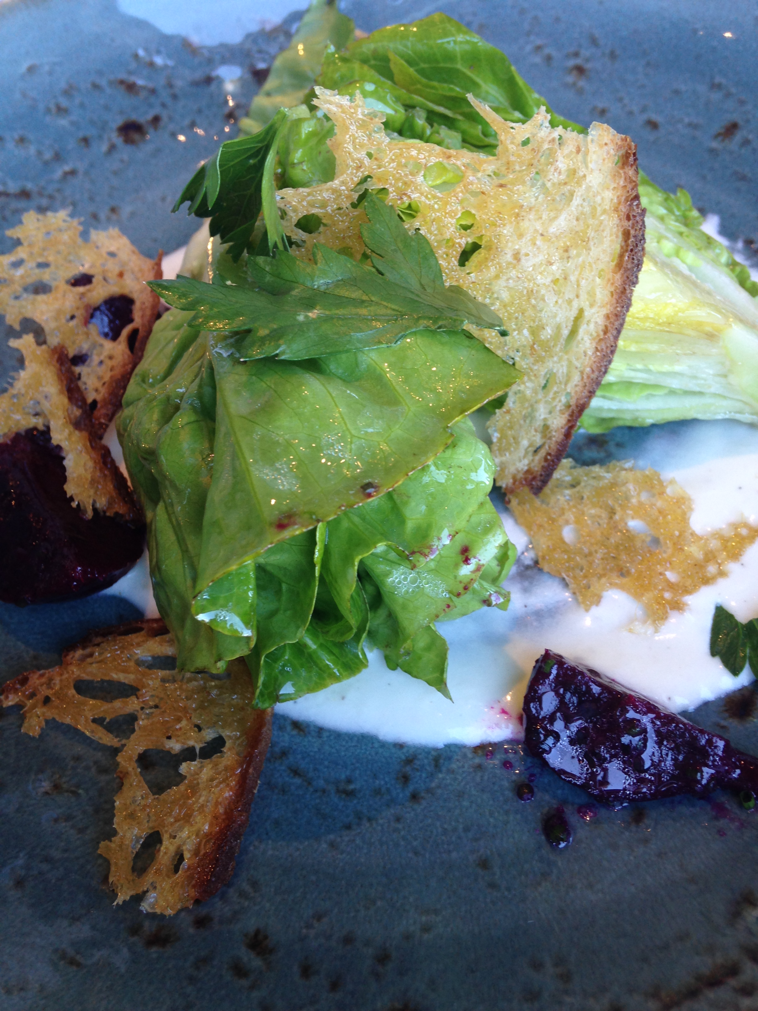 Little gem lettuce is awesome stuff. it’s delicate, and crisp, and just really lettucy tasting. I love it. I loved this salad. There were two or three little hearts in there, and three of us, so we each got one, to dunk and swirl in that garlic parmesan dressing that coated the bottom of the plate. The shaved levain croutons were pretty spectacular too. They were crunchy and just slightly oily; the combination made for a really great mouth feel.