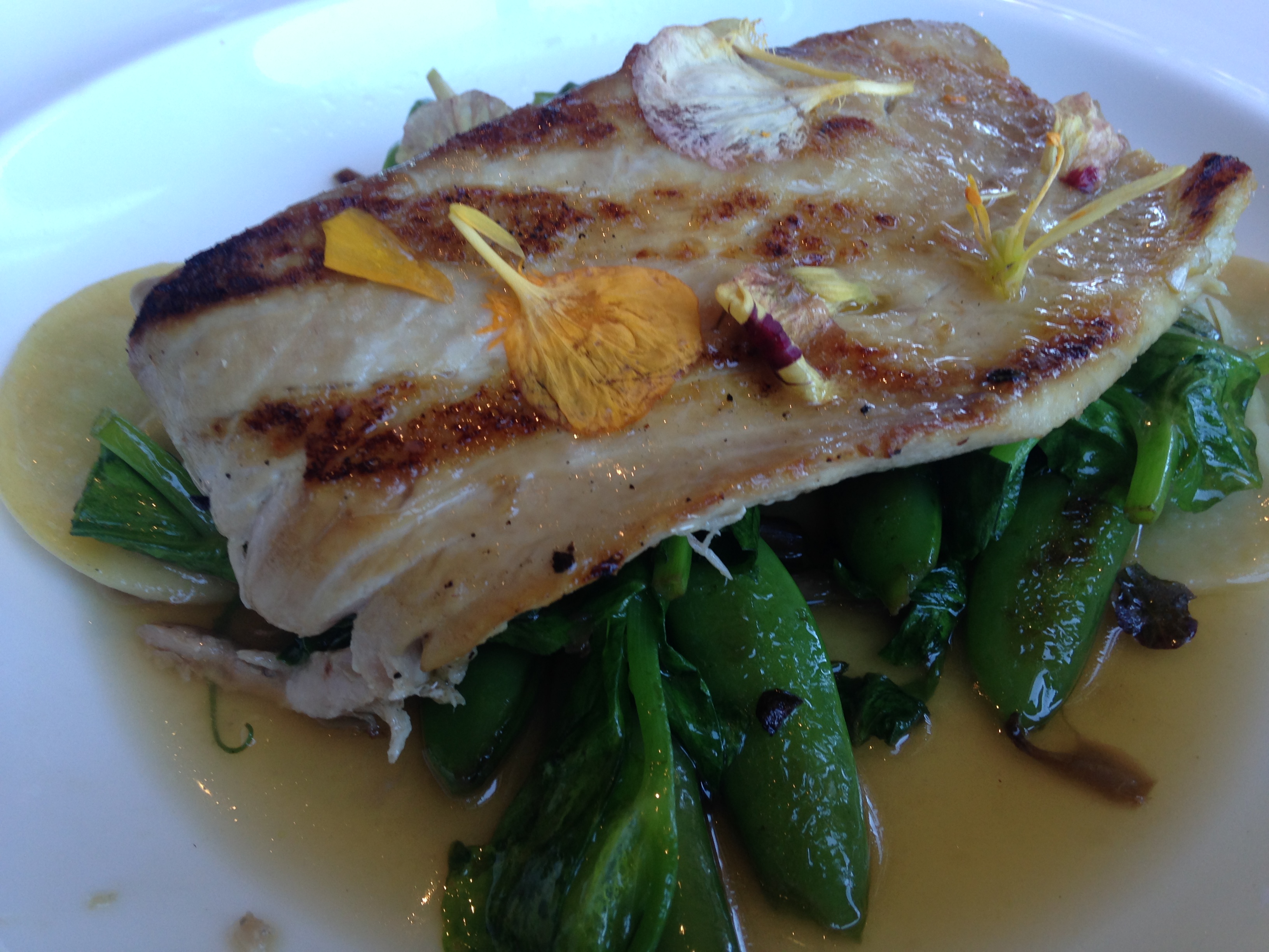 Our first main was the DAT grilled yellowtail jack with English pea ravioli, lemongrass broth, maitake mushroom, sugar snap peas, and pea leaves.