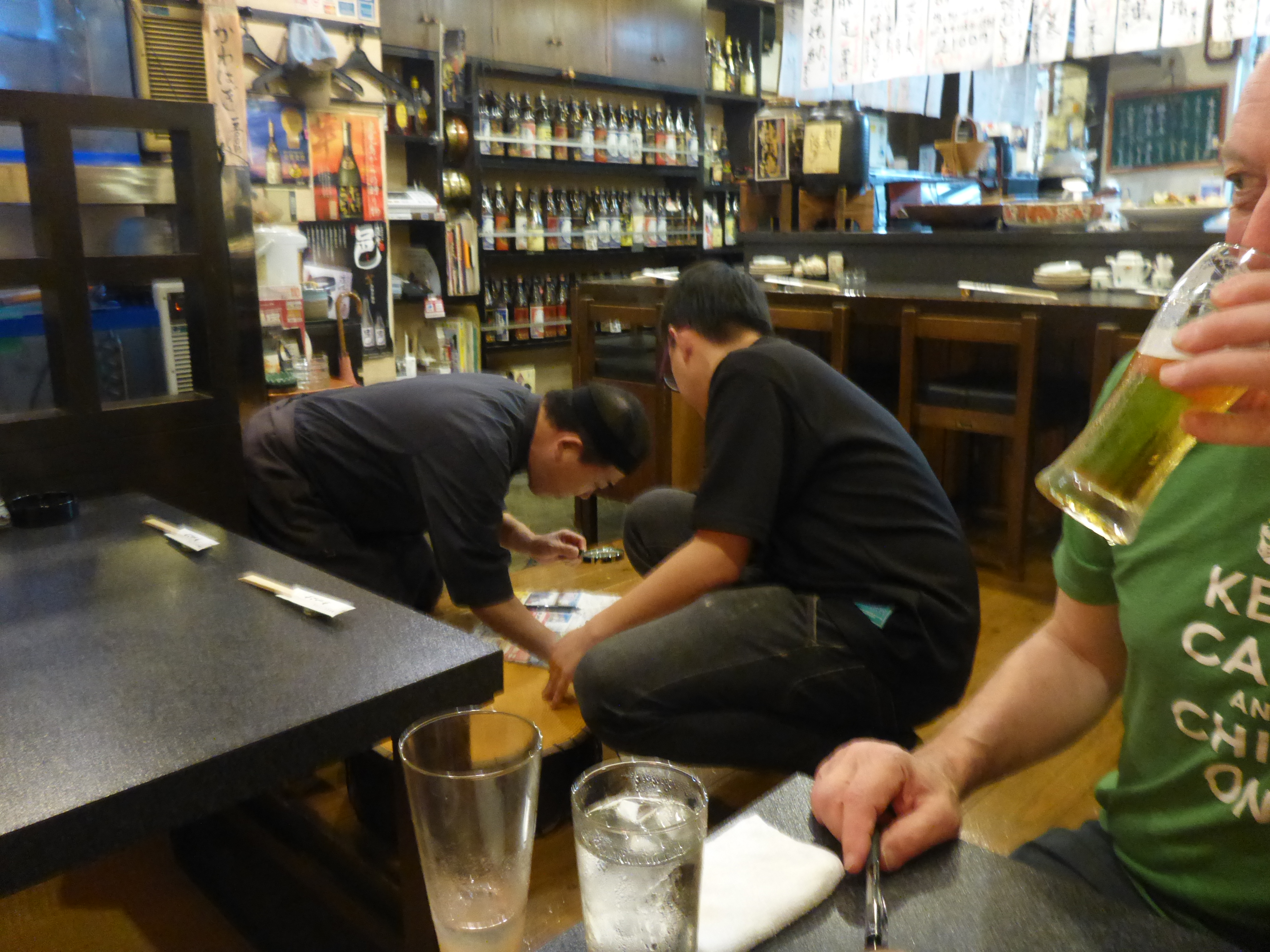 We asked our sweet young server (who was a Chinese intern, it turns out) for directions to the yatai. Then, to our surprise, the very serious sushi chef emerged from his post, armed with a magnifying glass, got on all fours on the ground and searched our map so he could aid in the giving of directions. I think we all pretty much fell in love with him and his cute as a button wife (?) at that point.