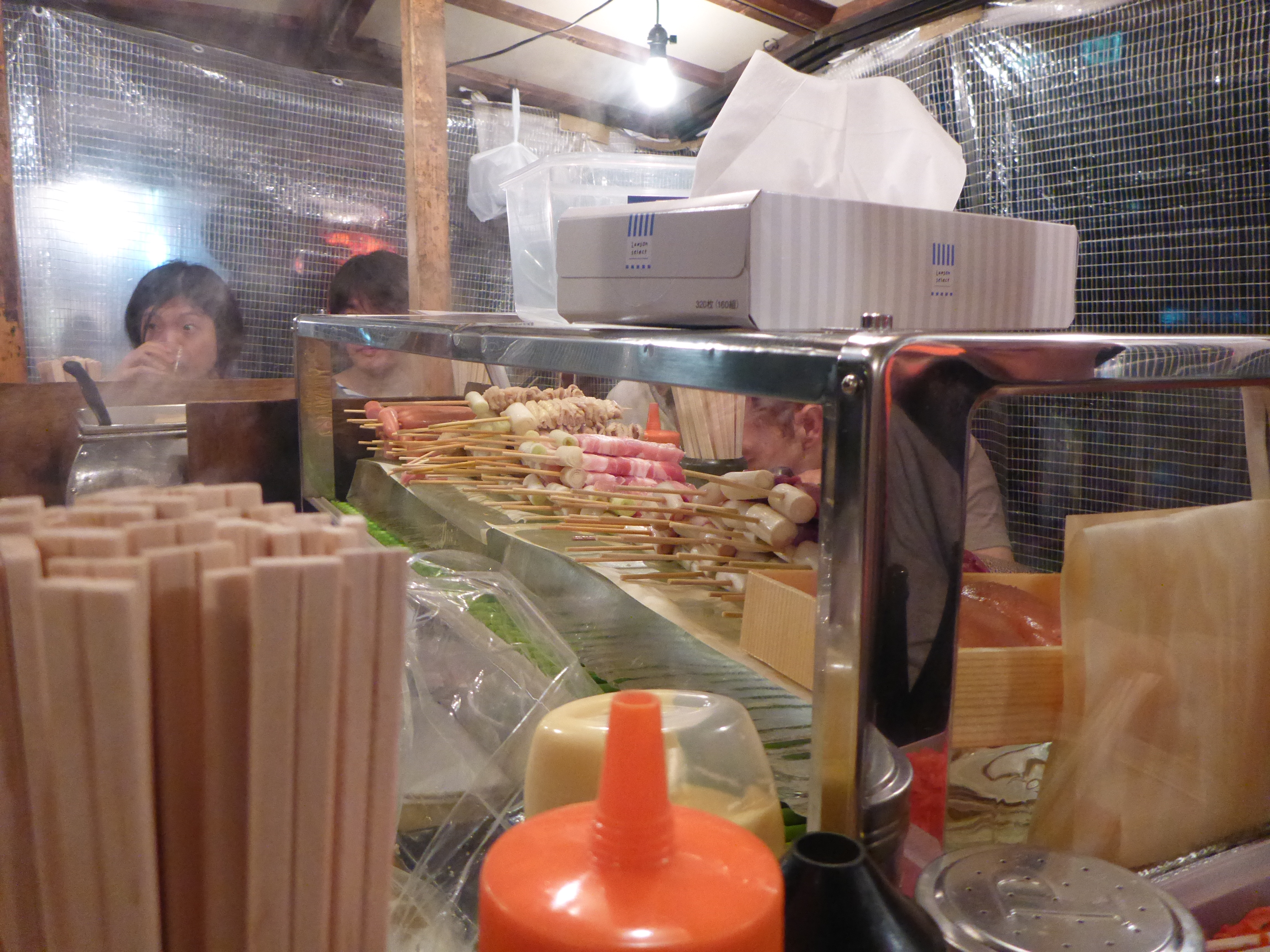 I have no clue what the last item was, but it was clearly their signature dish, as everyone in this yatai was eating it, so we ordered it, with a spirited “kanpai!” to the guys sitting across from us. It was some sort of fish cake served with hot mustard, and then this awesome vegetable (?) that was firm on the outside and really watery inside.
