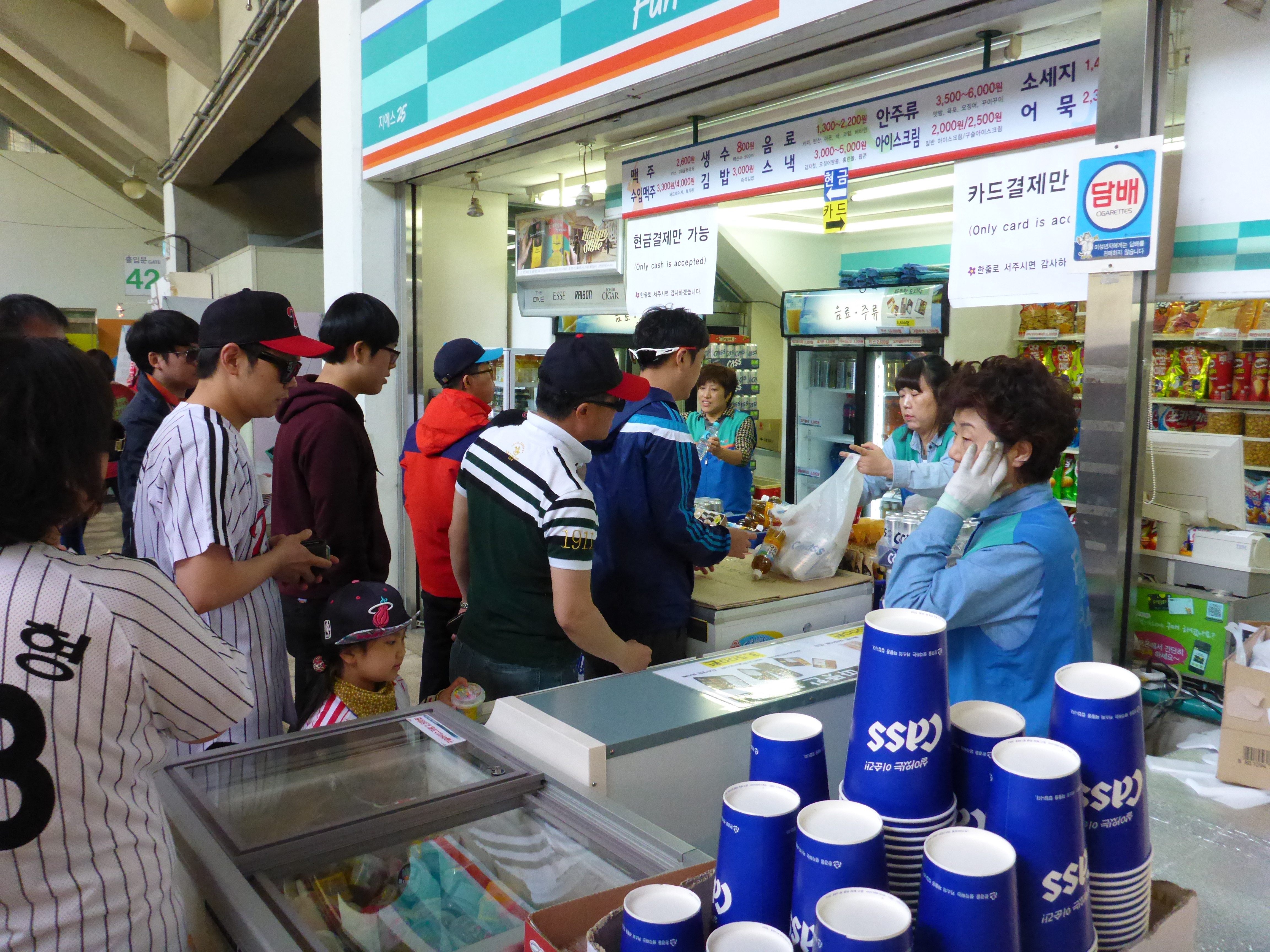 Some sage advice for you, dear reader. Post one person in your group in the entry line, and one in the ticket line. That entry line must have been a mile long by the time we got tickets, and the seating chaos that ensued as a result would have been mitigated had we been closer to the front. When we did finally get in, we walked into a drab concrete room, with one Family Mart dominating most of the space, bathrooms to either side, and the bottom of the stairs that would take us to the seats. There is no wandering/exploring the ballpark at Jamsil if you have GA tickets. That was the only area to which we had access, aside from the seats.