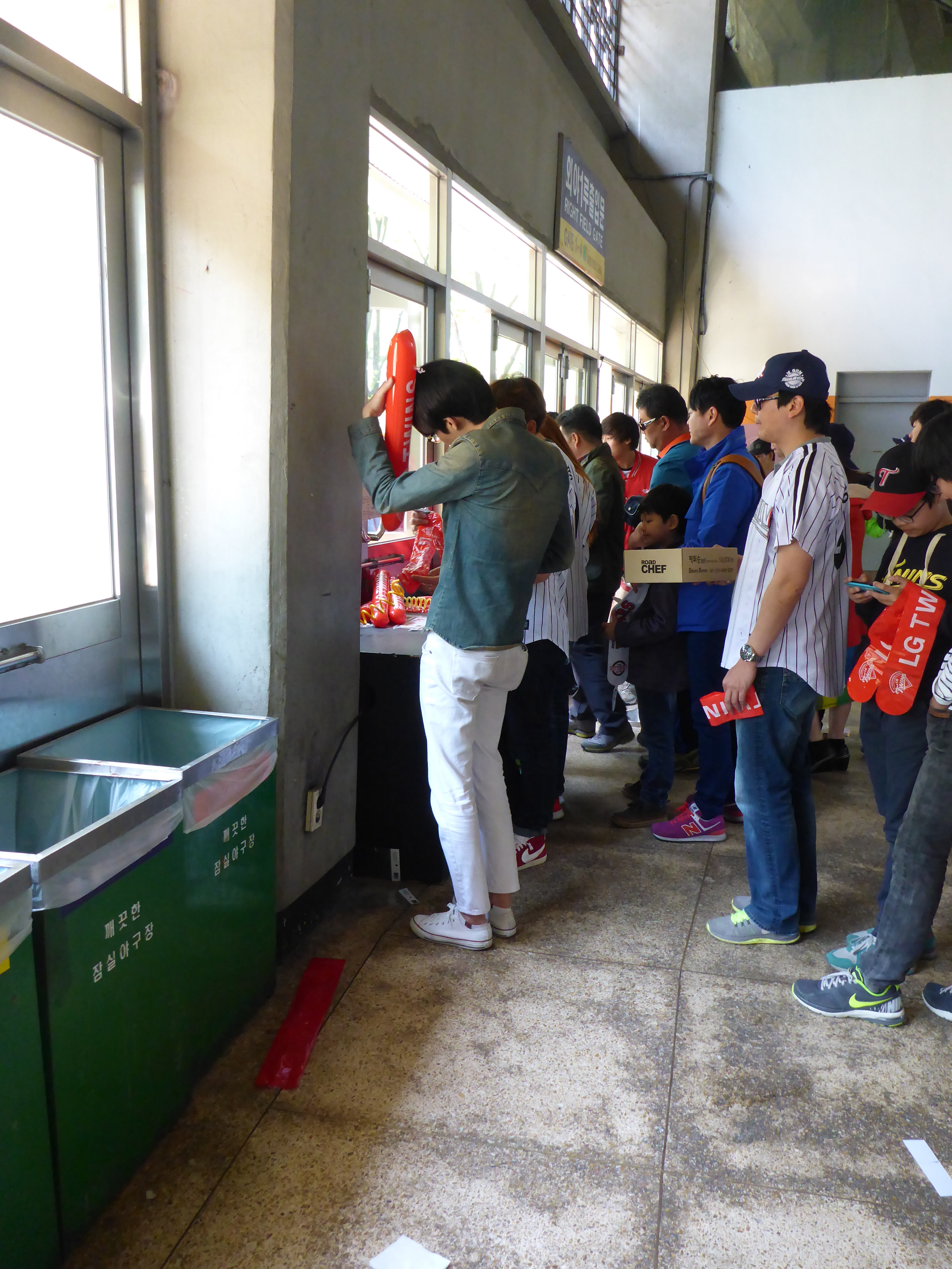 Outside Jamsil, there are myriad opportunities to buy food, beer, and baseball paraphernalia, which we took turns exploring while one of us held the groups place in line. The really awesome thing? You can take any/all of it in with you. Beer included. While there were the usual fast food opportunities, there was also some strictly Korean fare, like dried squid, ttokbokki, gimbap, and of course, Korean fried chicken. The tall boy beers were a mere three dollars. Three dollars! At a ball game!!??!!