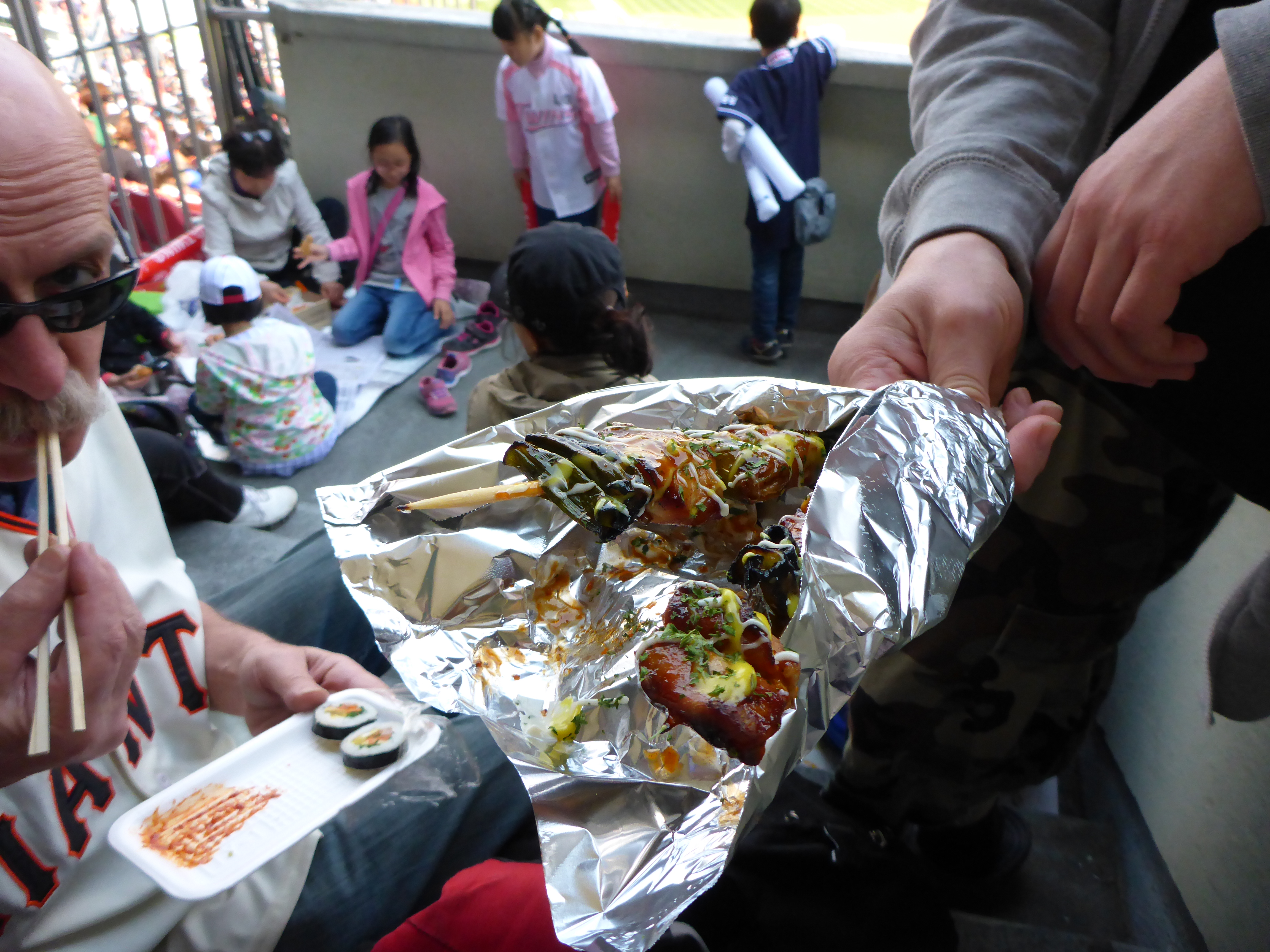 When we returned to the stadium, we noticed a BBQ (pronounced Bee Bee Que) Fried Chicken stand on the stairs, just past that random picnicking family. BBQ is one of the most popular/famous nationwide brands, so…you know, we bought some to try. And some beer. Dur. **I’ve been told since I posted this that is not actually BBQ, though the logo was the same-I dunno**