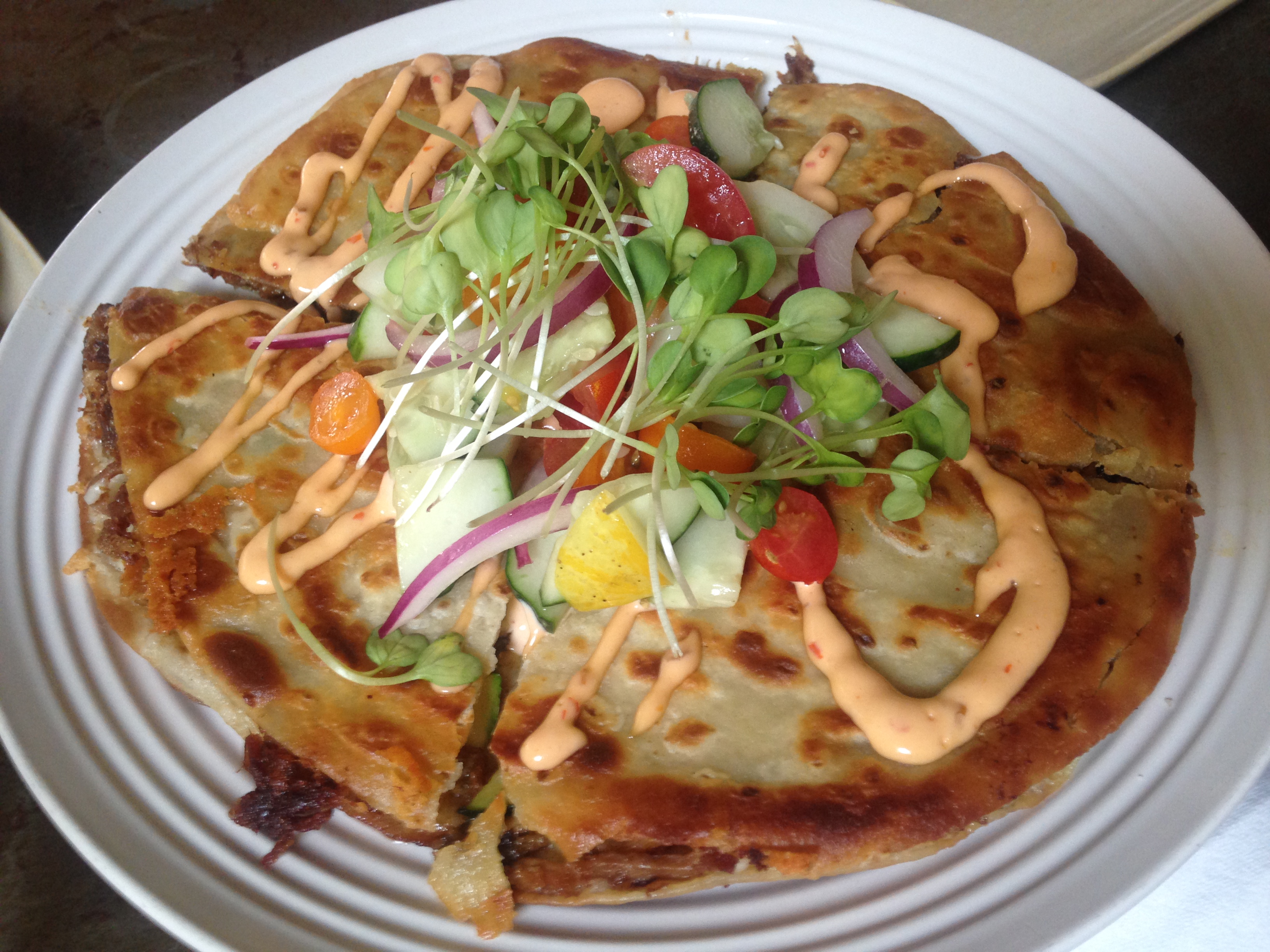 The pork carnitas quesadilla was my absolute favorite…worthy of a trip to Healdsburg just to have it. Arrrggglllarrrrgggg….that tortilla was perfectly thin and crisp, crusted with burnt cheese (the stuff dreams are made of) filled with moist, yet crisp in spots, carnitas, with the added spectacular surprise of zucchini inside, and the genius addition of fresh vegetables on top. Why isn’t this done more often? Those fresh veggies on the top redefined the whole deal. Do you realize how refreshingly delicious it is to eat a dish that rich and savory and meaty, and then you hit a crunchy, watery cucumber, along with a juicy, sweet, tomato? Oh, and microgreens? Puh-lease!
