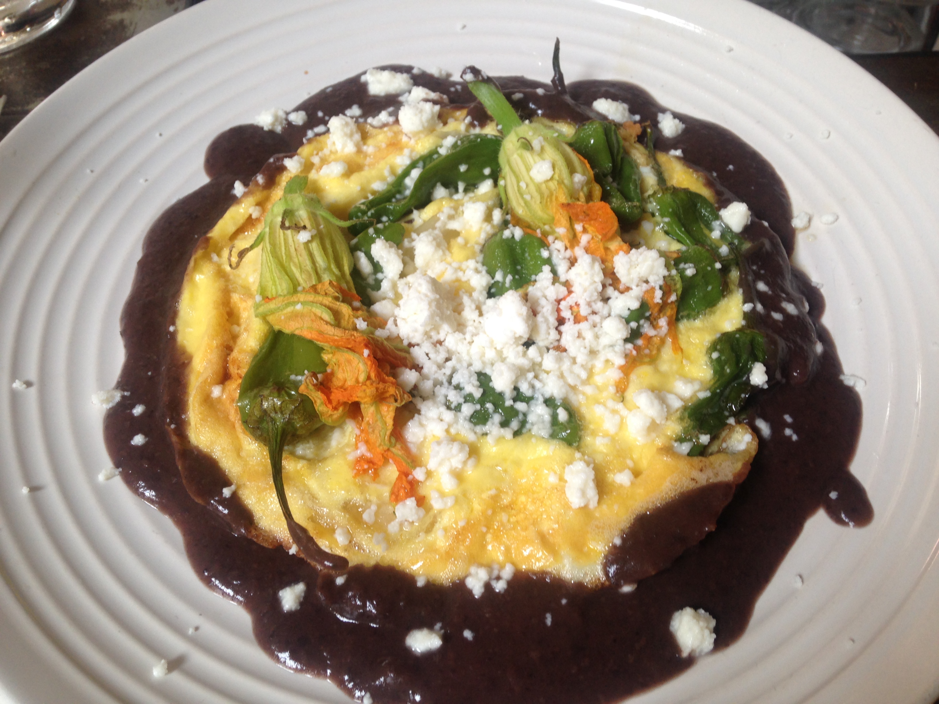 The tortilla espanola, an egg omelet served atop a bed of refried black beans, drizzled with cotija and topped with squash blossoms and peppers, was not only beautiful but also wonderful tasting. Despite that list of somewhat heavy ingredients, it was actually quite light.