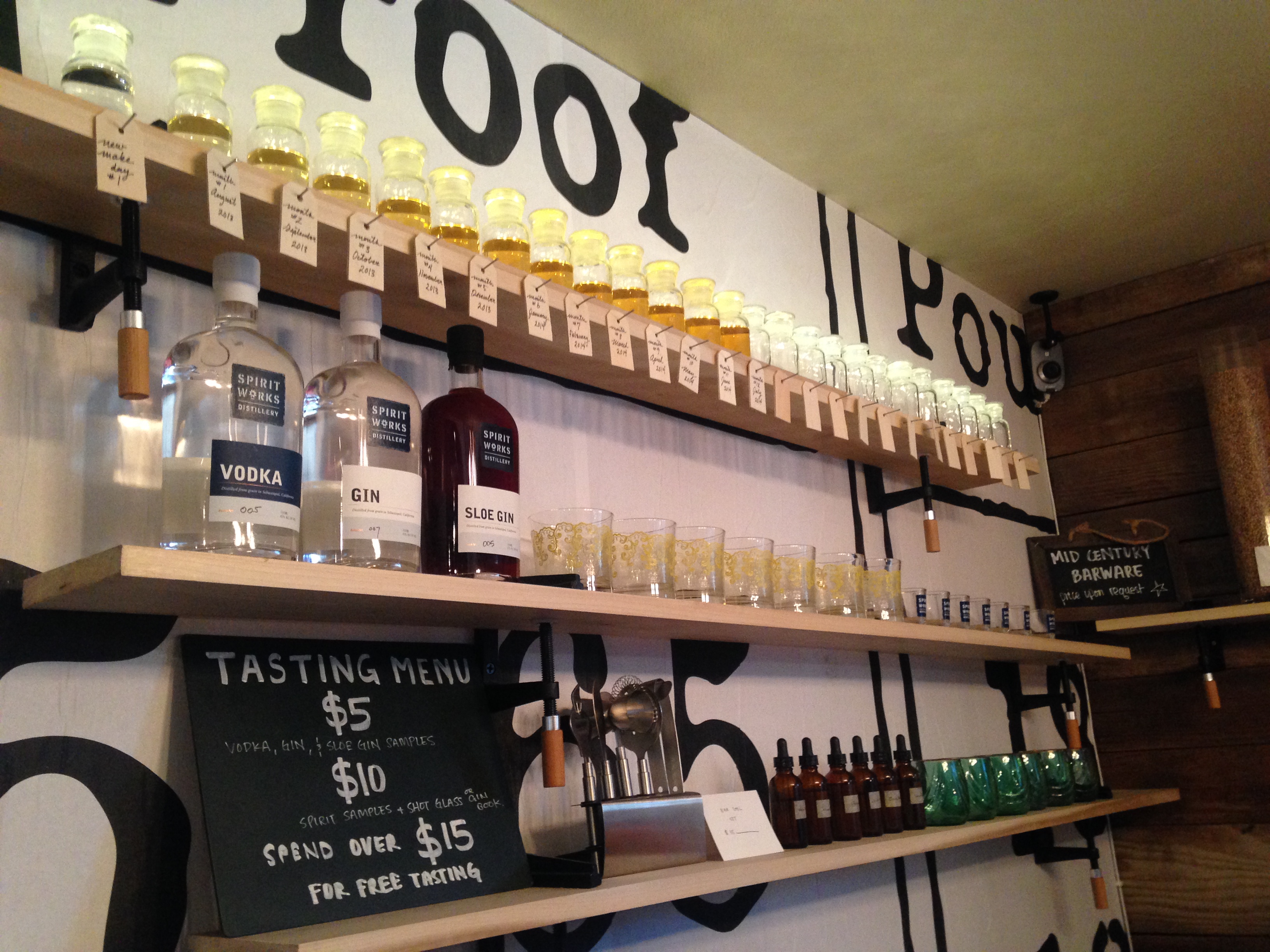 Spirit Works was minimalist and cute inside, sort of hipster and modern, with one small room mostly filled with merchandise, along with the tasting counter, and one large window looking into the actual distillery.