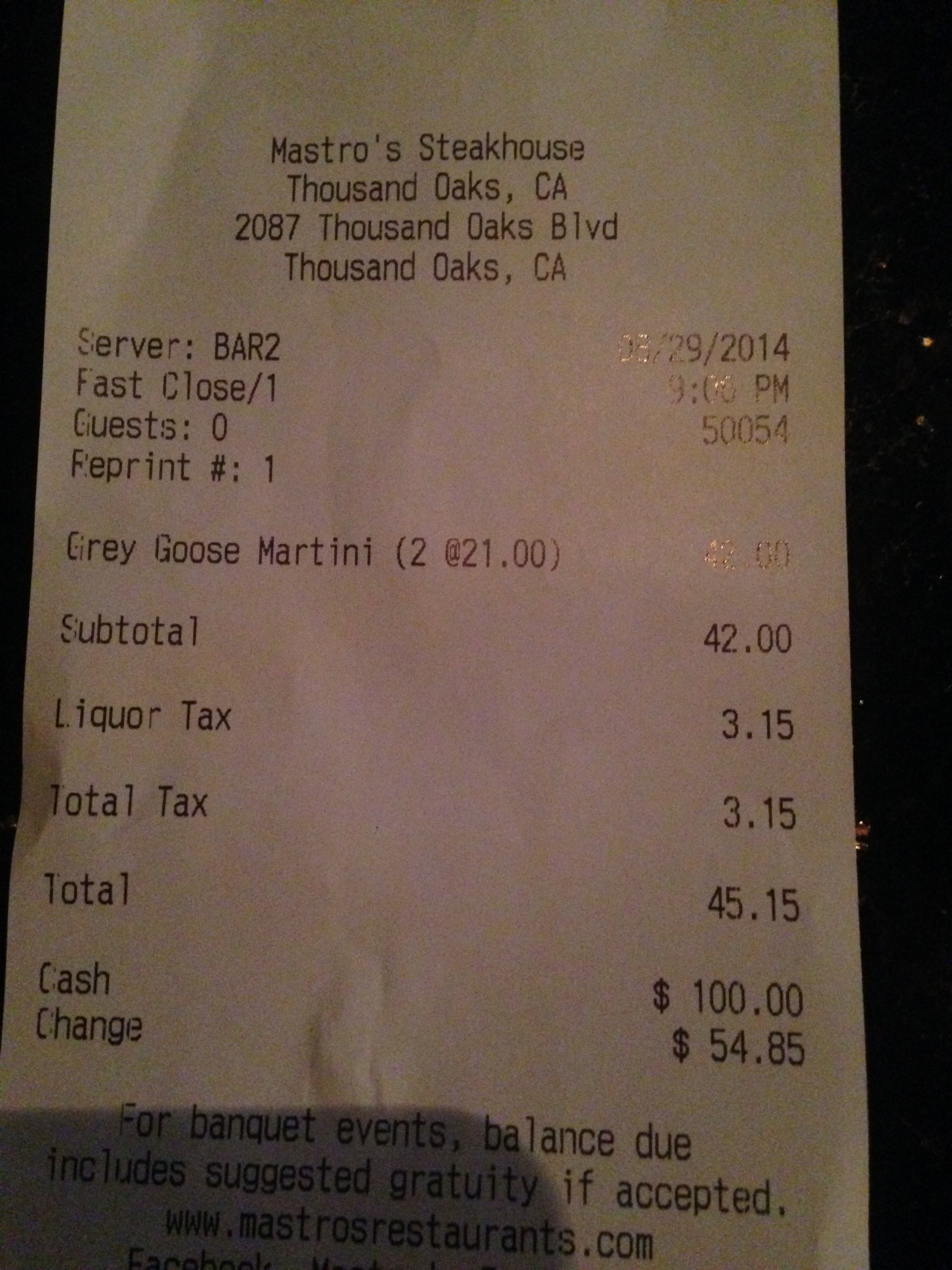 My sister ordered us a couple of martini’s, and sweetly told me that she would buy them. The bartender handed her the $45 dollar tab and…wait, wait, wait. The $45 tab? That’s right. I read it right and so are you.