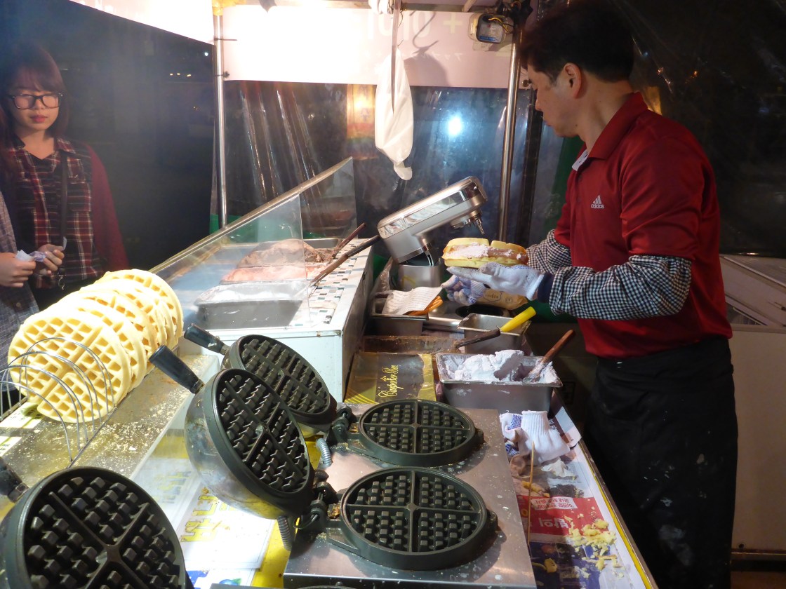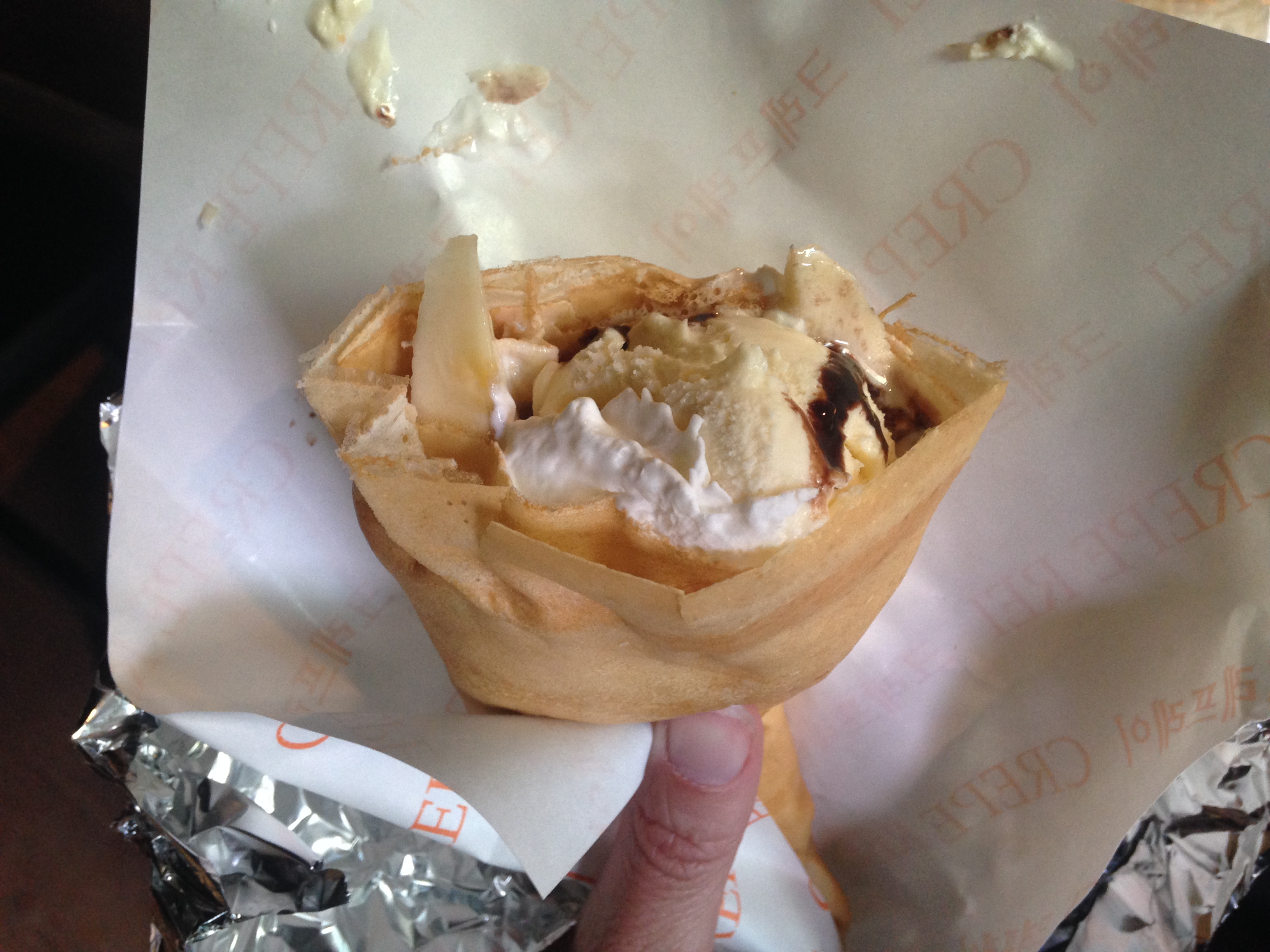 The cracker thin crust of the pizza, the hormonal/emotional fulfillment of eating carbs, red wine…I was starting to feel whole again. Even the French guy started to warm up. I was seated next to a regular, a Japanese man. He didn’t speak much English, but he was sweet as pie, and at one point he disappeared and then returned with a sundae rolled in a crepe, one for each of us. He owns the place that makes them, it turned out. They were delicious, and the kind gesture of him going and procuring them for us as a little gift almost made up for the days atrocities. Almost.