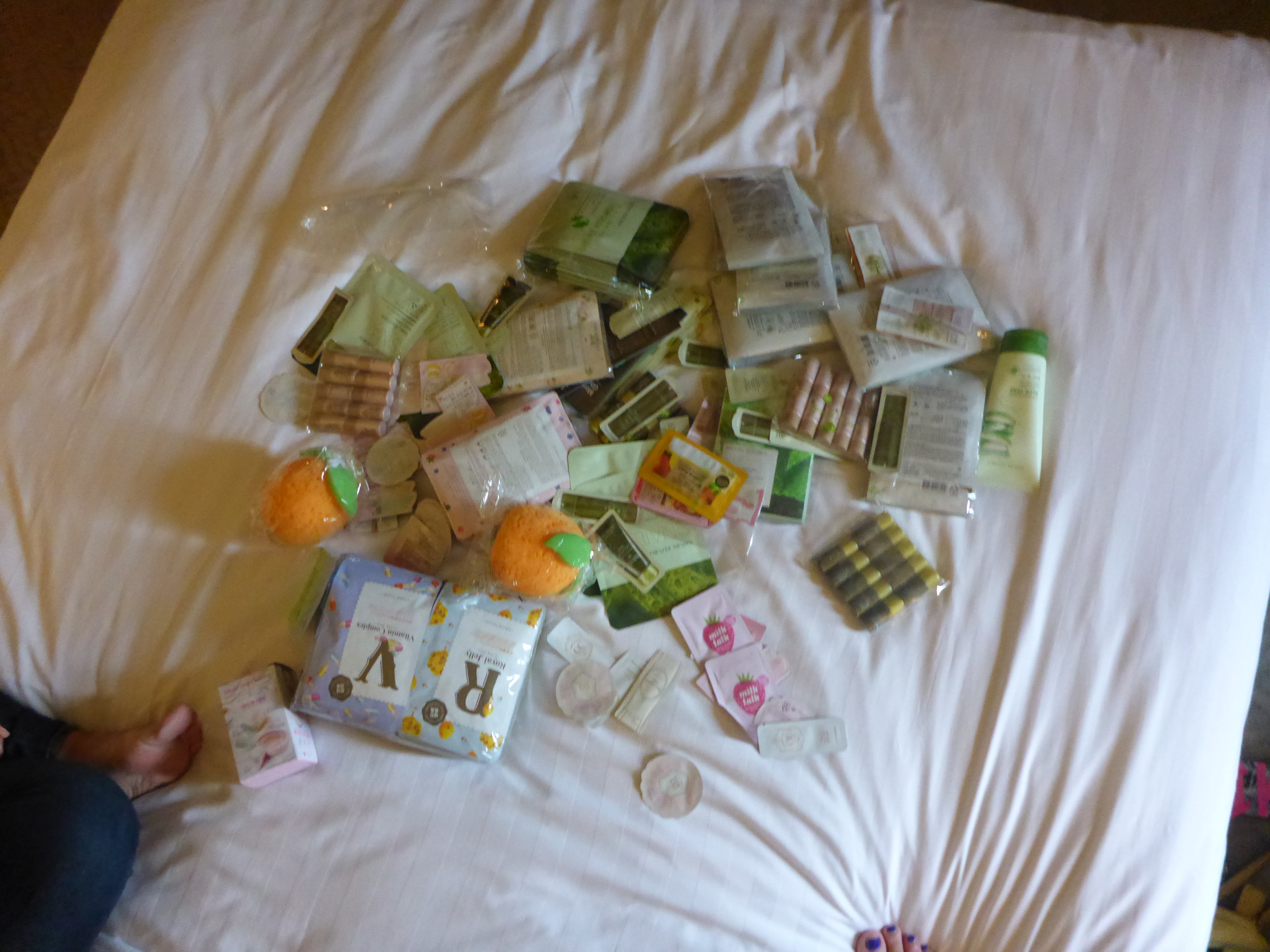 Since the boys vibe was so buzz killy, we left, and headed back to the hotel for a quick inventory of our shopping loot, and a divvying up of free samples and joint purchases that Randi and I had made. The free sample situation is pretty insane. With the exception of those rectangular packages, the face masks, everything else in this photo was a give away.