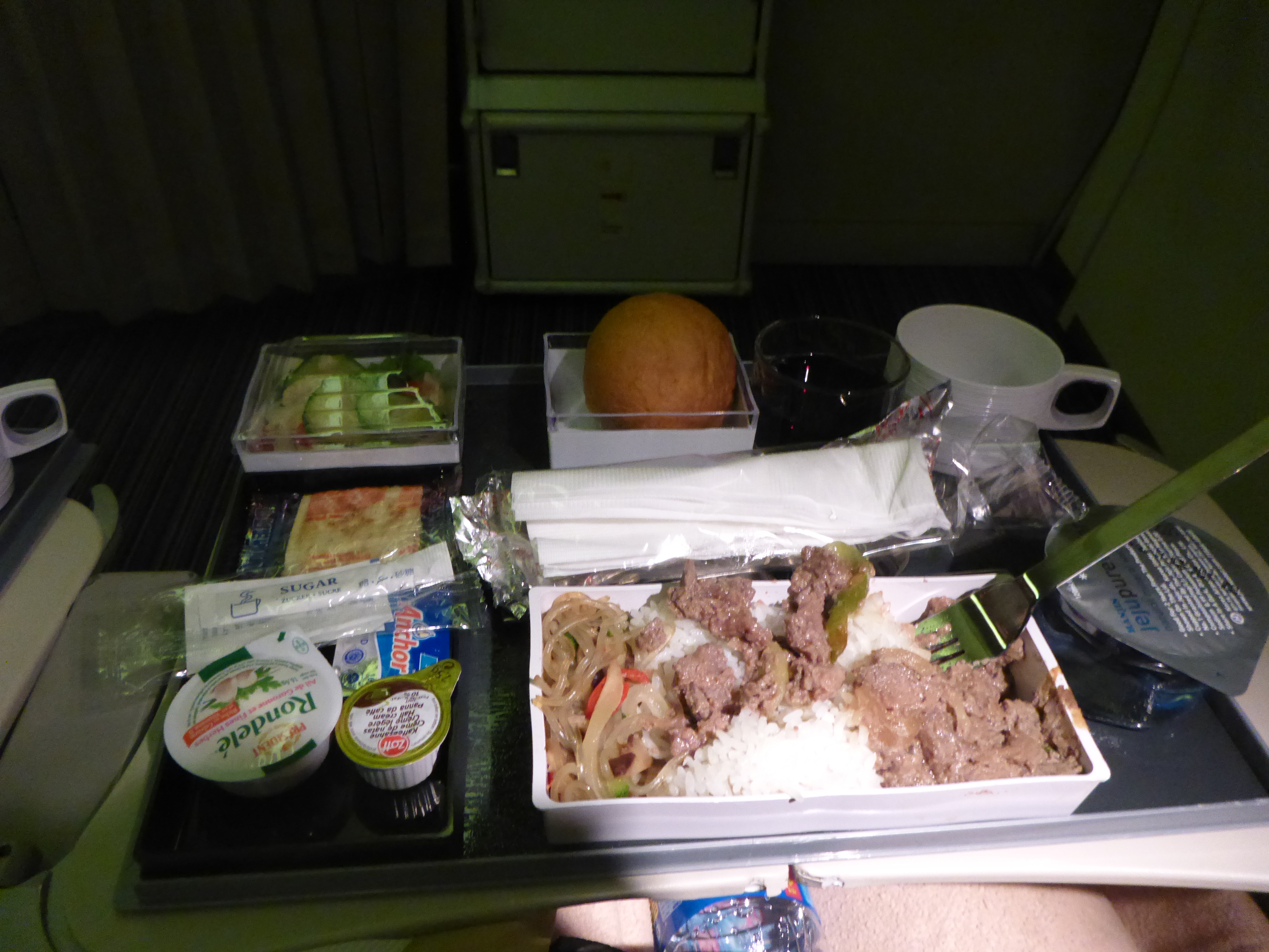 The flight home was the antithesis to the flight there. It seemed to take twice as long as it should have, I was wicked uncomfortable (though our seats were the same, I think my body was just so full, and bilious, and the extra weight I’d packed on wasn’t helping a thing, and I didn’t have fun vacation to look forward to), and the food was a total bummer.