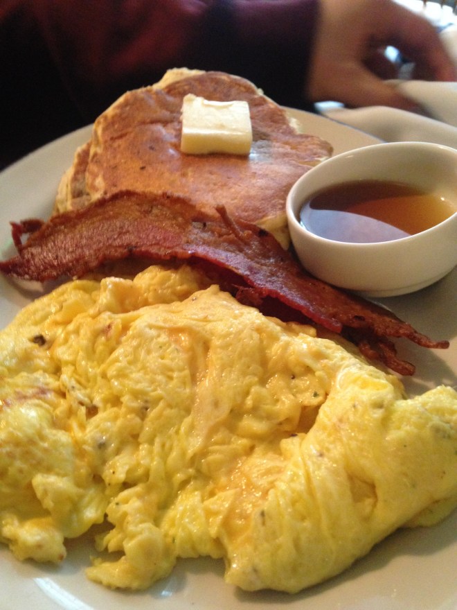 On to breakfast. I’ll start with the simplest guy, the one that everyone offers, everywhere. Eggs, bacon, pancakes, aka “The Stack.”