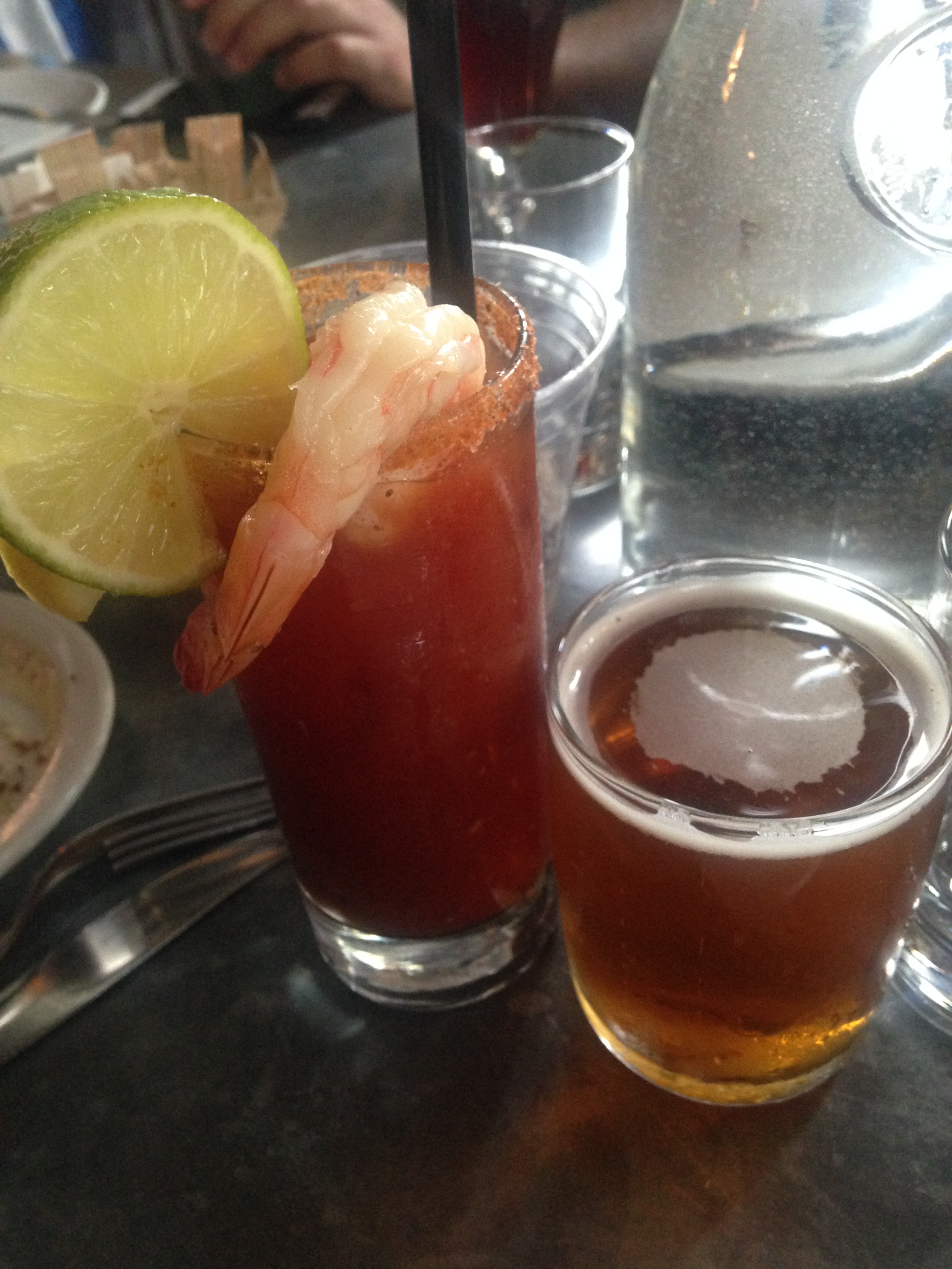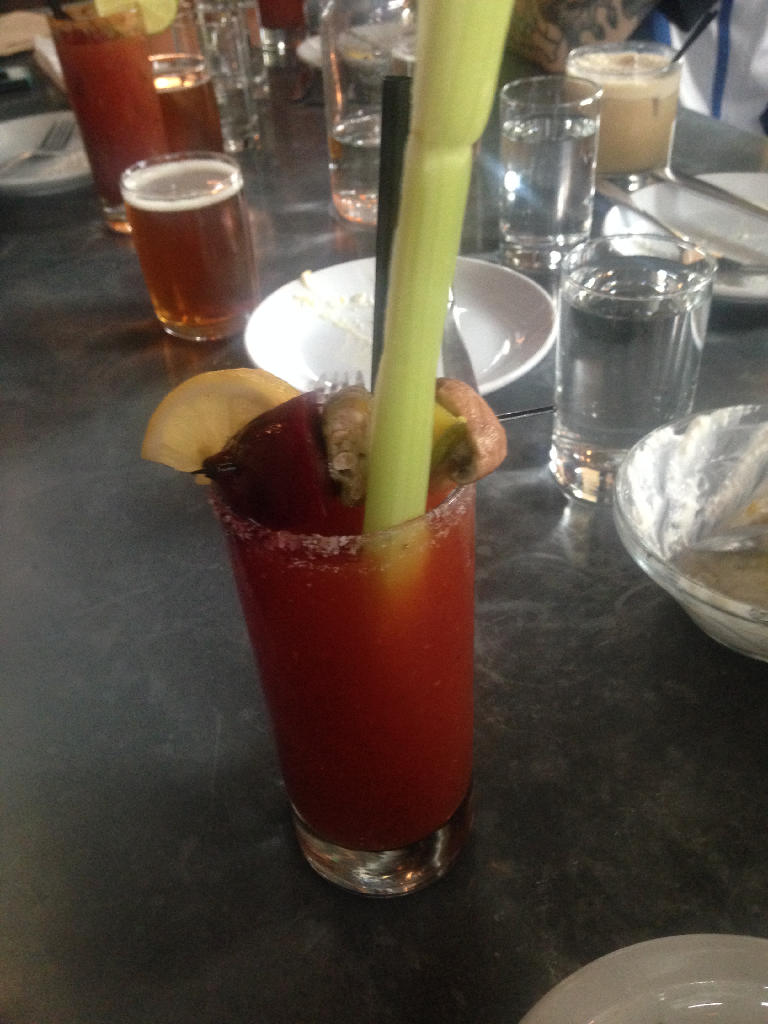 Not to be a total jerk, but Tasty N’ Alder was what I was hoping Clyde Common would be, with unique menu items that gave juuuust that bit of a twist to make things interesting. For instance, the bloody Mary selection, which includes no less than five renditions of the old standby along with the option to “make it a Midwestern” (aka add a beer back) or make it a “skinny james” which means the addition of a meat stick. We sampled, I think, three of the five options. I went with the Dockside, a mix of gin, kummel, tomato, old bay, and “shrimp,” made Midwestern. I say “shrimp” because, come on now, that’s a freaking prawn.