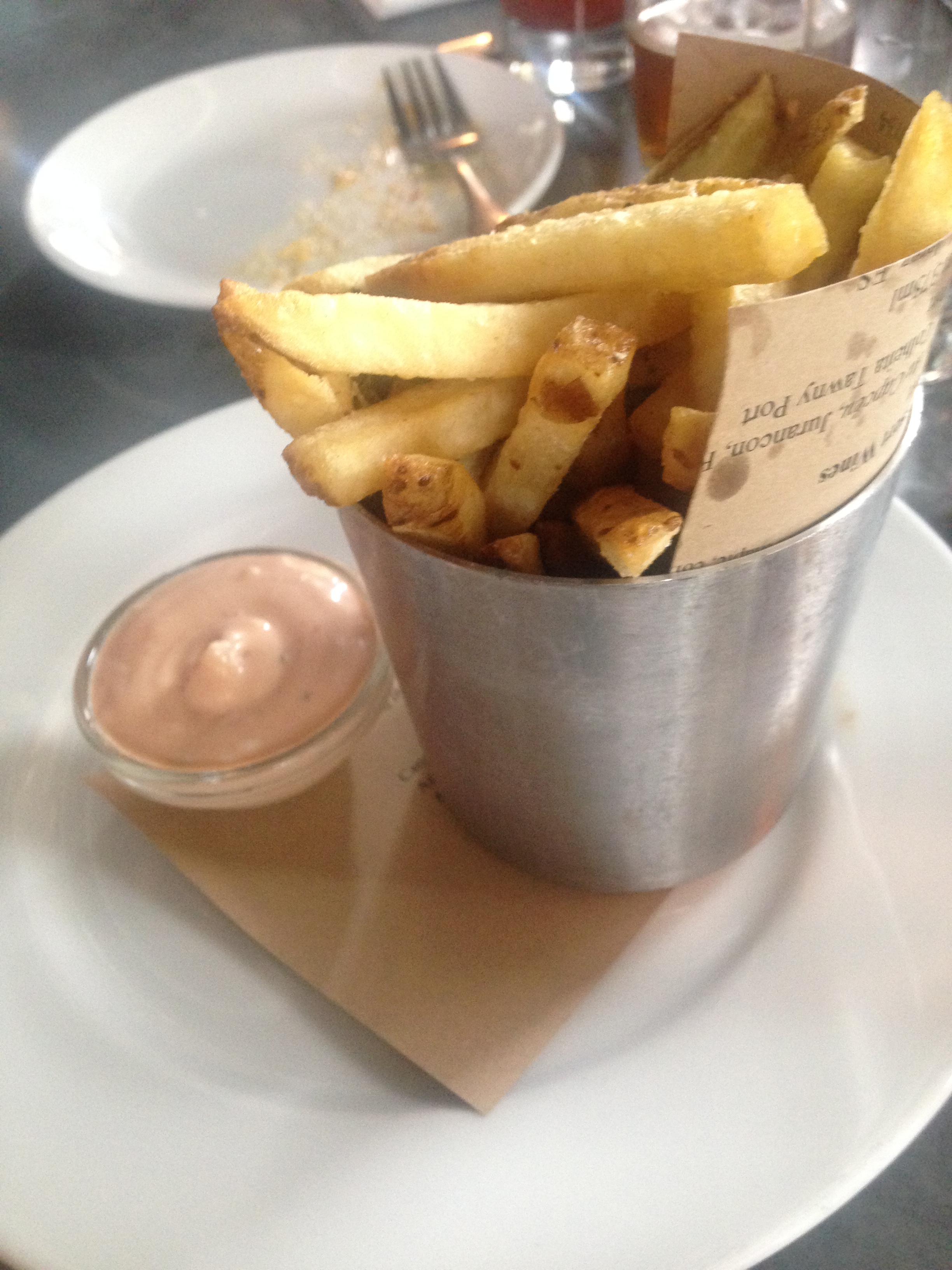 For a side, one salty, hand cut, crisp, creamy, order of spuds fried in Wagyu tallow with a mayo based dipping sauce