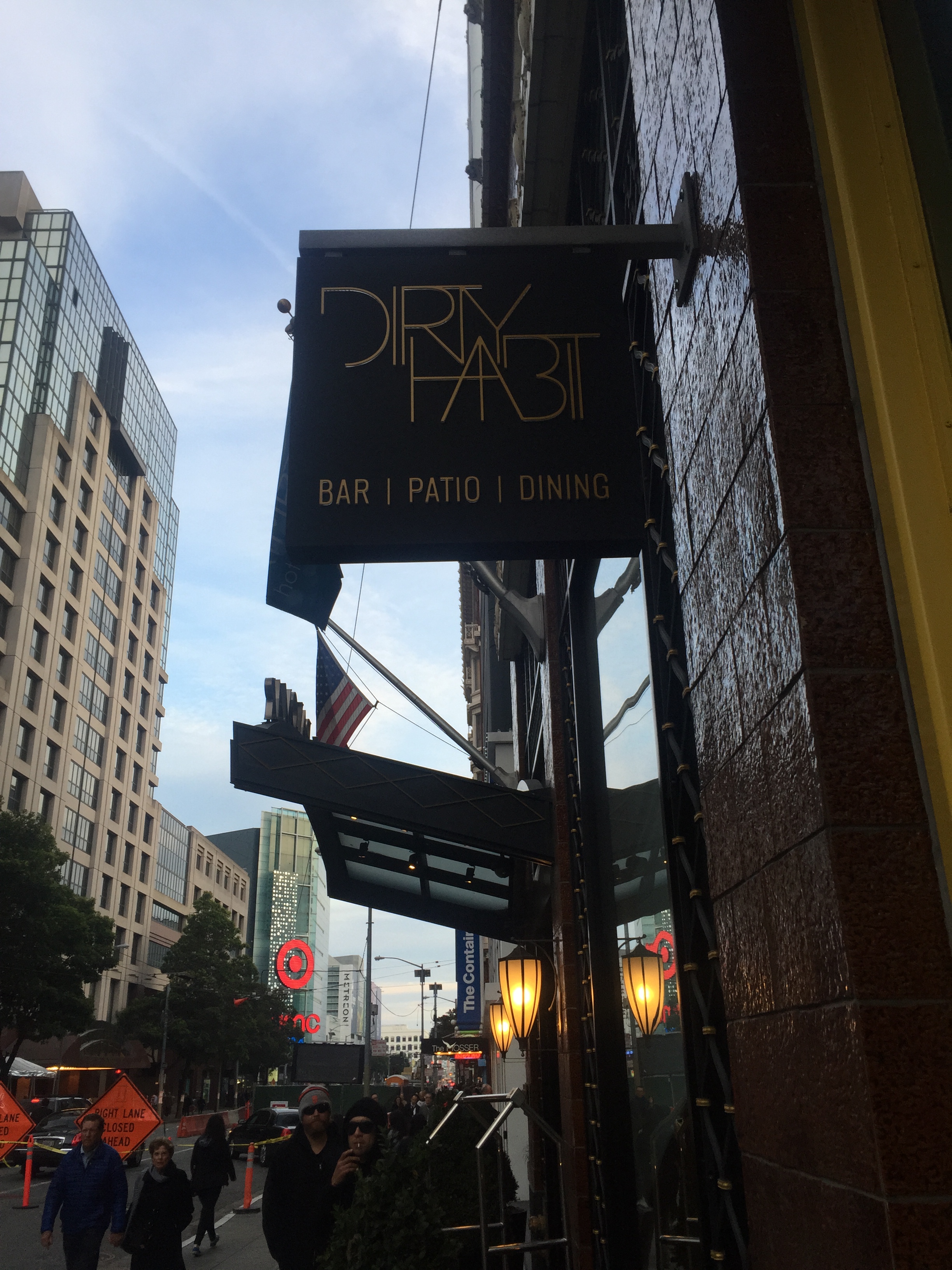 I love Dirty Habit’s locale. It’s on 4th, about one block south of Market; right behind the flagship Old Navy, actually, which also means that it’s about a block away from Bart, near numerous parking garages, hotels, and movie theaters, a quick and easy walk from my apartment, and also, that I will be stopping in for a drink and snack shopping respite during this upcoming holiday season. Also, the space is totally wheelchair accessible, as it benefits from the large elevators and wide hallway layout of the Hotel Palomar, where it resides on the fifth floor.