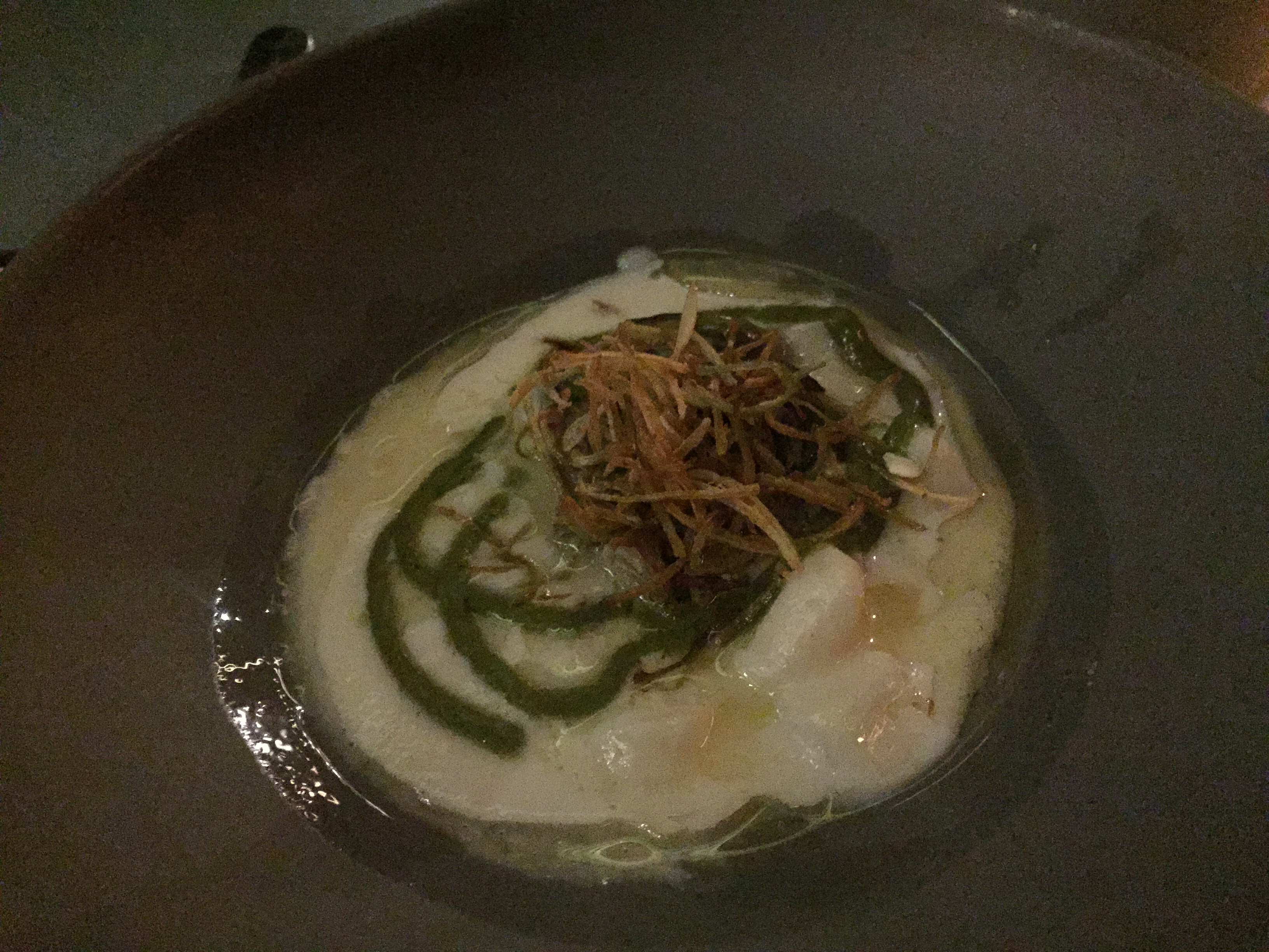 Next up, the warm oysters with melted leeks and sunchoke cream. When it arrived we were concerned that it was a one person dish; one large oyster, but they keep things sharable at Dirty Habit. There were four perfect, warm, little oysters swimming around in that decadent sauce. This dish had a ton of depth of flavor, the leeks tasted as though they had slow cooked for hours (I’m sure they probably were) while the fried leek garnish complimented the rich cream with a flash of salt and crunch.