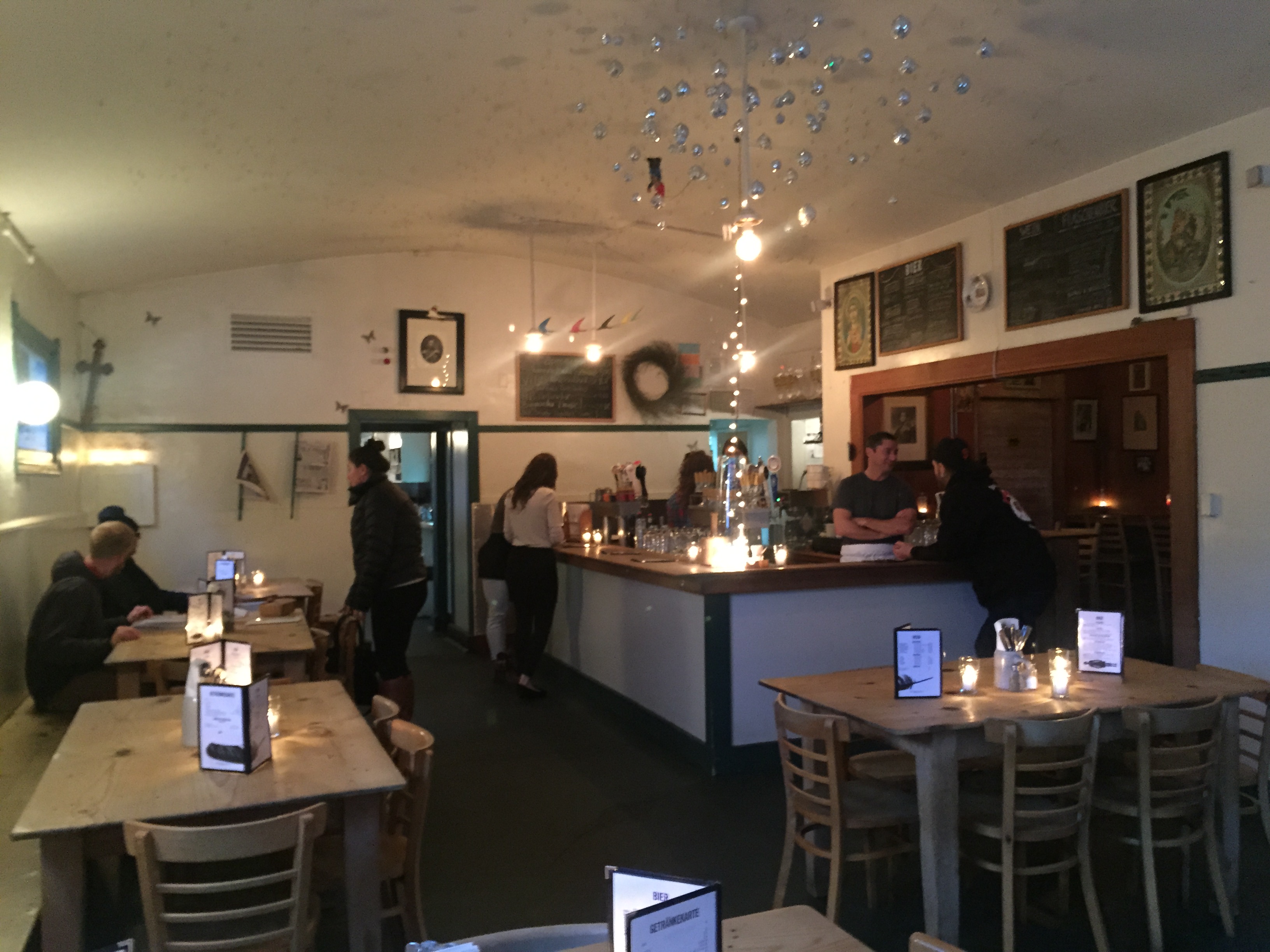 The interior is pure Bavaria, with white, stone walls, that rounded ceiling so popular in European beer halls, blond wood picnic tables, and a cozy little bar. In addition to the front room shown in this photo, there is a room of about equal size, with larger/longer communal tables, if memory serves, in the back.