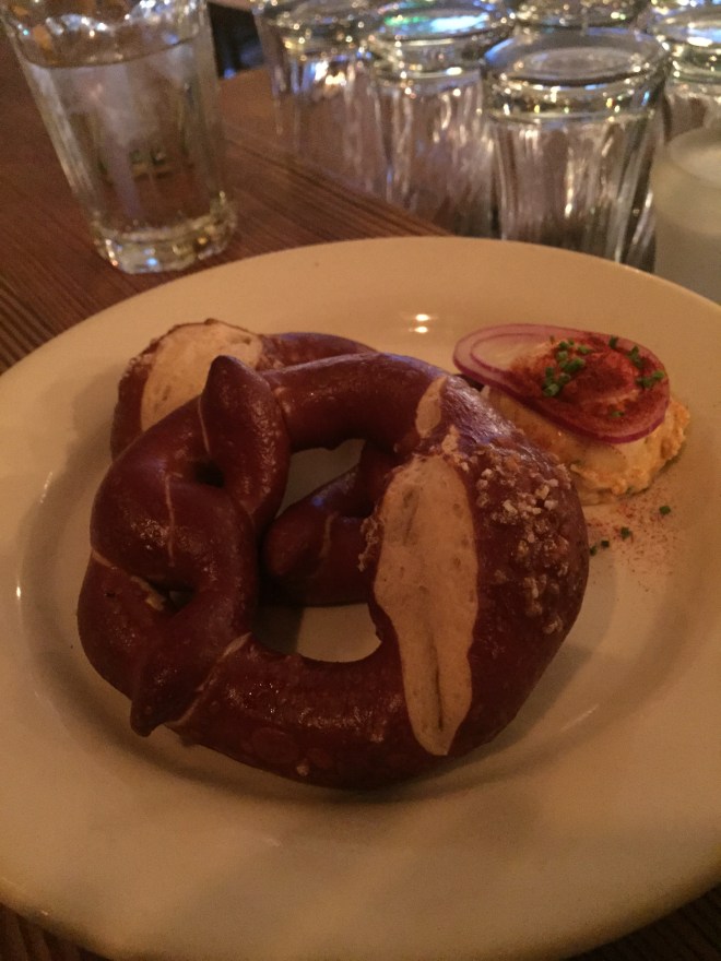 Soon, we were seated, at a table with another random group of four, which is how we like it. It’s much more fun to drink with strangers, to heft your liter to the center of the table for a big group “prost!” and, I think it makes the dining experience much more interesting for out-of-towners who get to chat up locals other than us. Brown bread with herb spread is brought to accompany pre-dinner beers and keep people from getting hangry. That herby cheese is so freaking perfectly Germany and the bread has a really nice dill flavor. It’s seriously good stuff.
