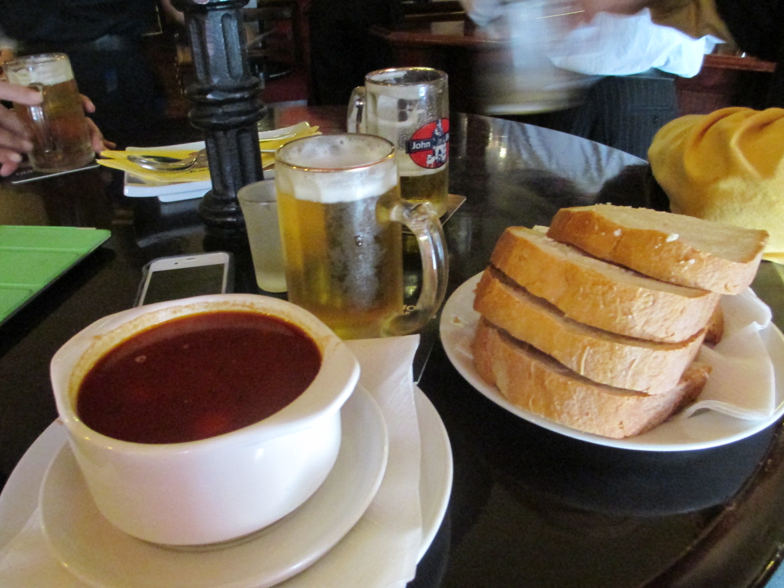 Not at all satisfied by our paltry, pre-wrapped salami sandwich, we crossed back over the river in search of Borkhonya WineKitchen, where we planned to have lunch. However, a Union Jack suddenly appeared, which meant pints, which meant we quickly scurried over to the John Bull Sports Pub, like sharks to scrum. http://www.johnbullsportpub.hu/index.php?lang=2 They weren’t quite open yet, but a guy came out who told us we could sit at one of the outdoor tables and have a drink, which of course, we did.