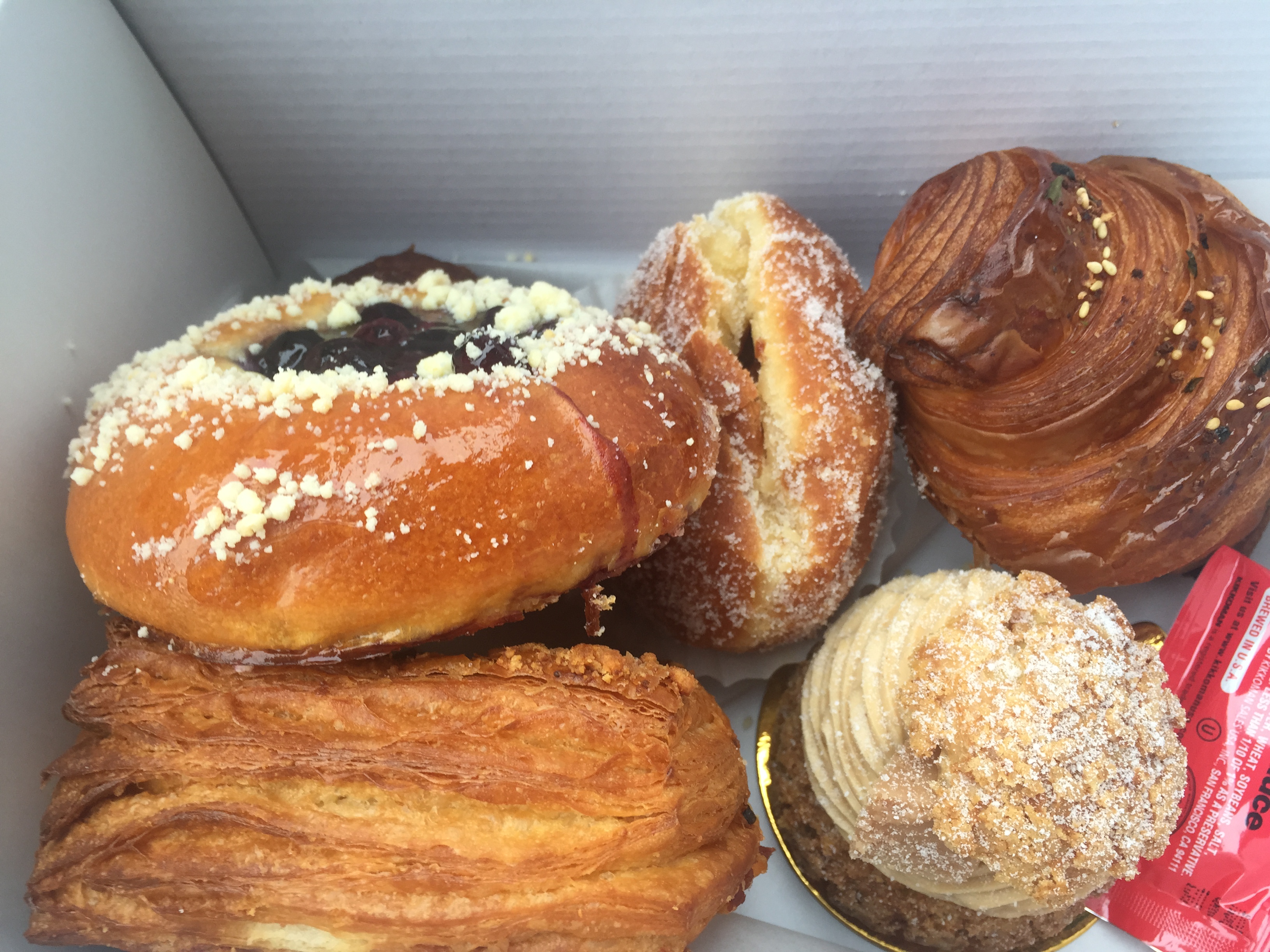 The pasty counter is a fairly short one; behind it, stacks of baked butter and sugar, in myriad forms and varieties; donuts with vanilla cream, donuts with salted caramel, Amelie ammans, plain croissants, chocolate croissants, California croissants (savory: that day, filled with wasabi and smoked salmon, dusted with sesame), artichoke Danish, ham and cheese Danish, blueberry brioche bomb, Ferrero Rocher choux bomb.