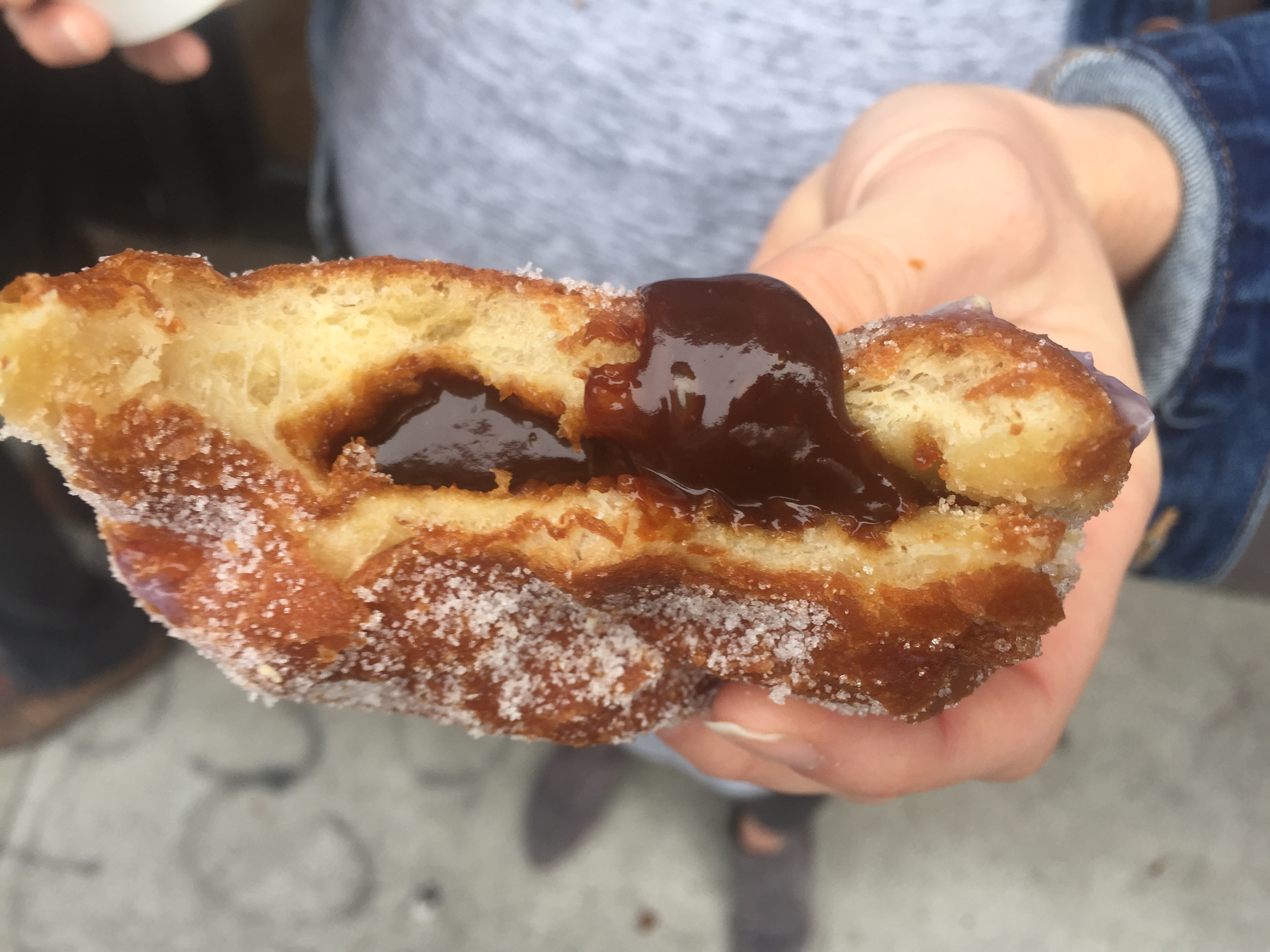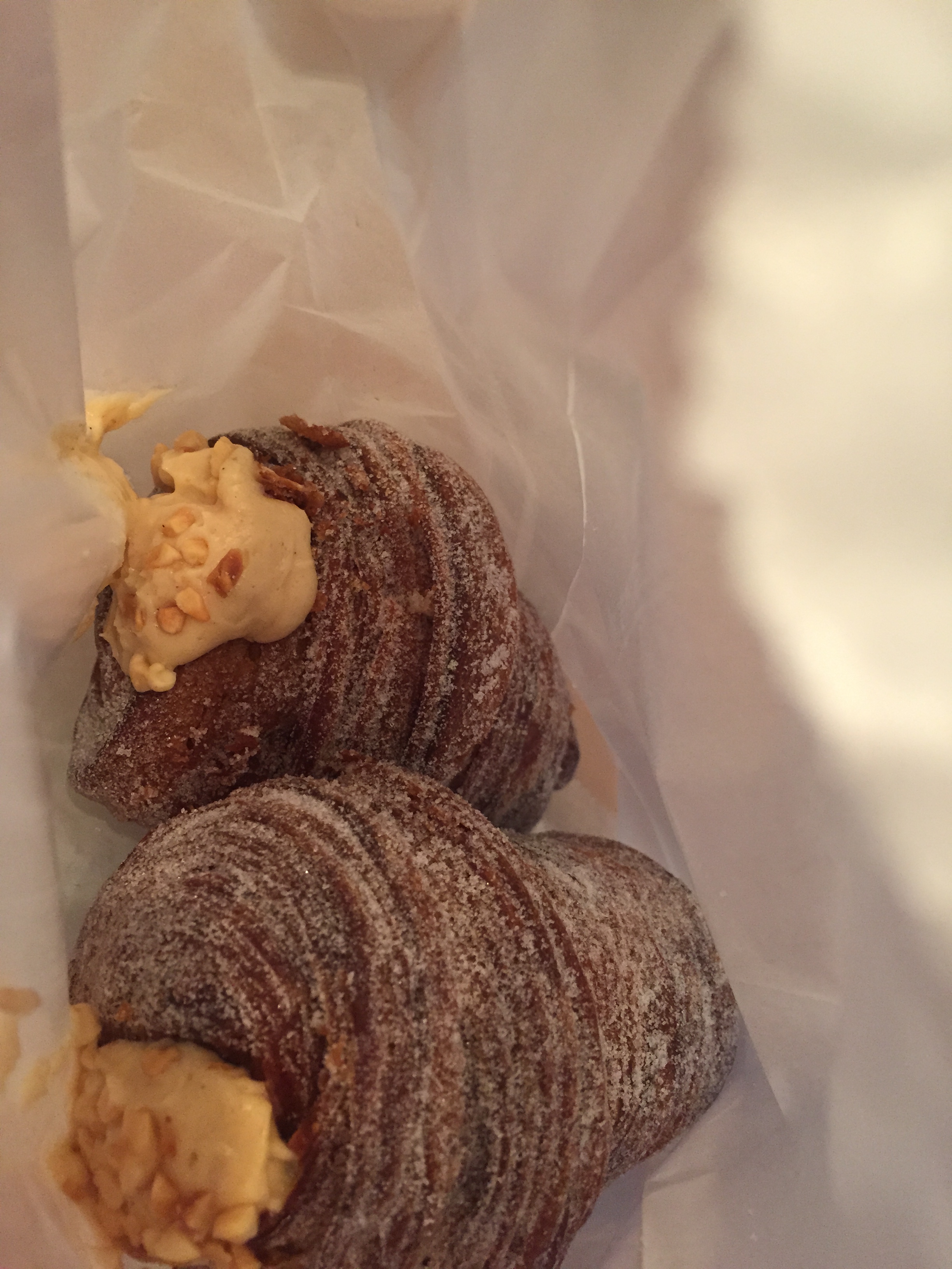The cruffin. They make one flavor a day. That day, it was fluffernutter, which rocked my world in a crazy way, but I know a couple of peanut butter haters who would have really had their day ruined by that announcement. We were handed our allotted two each by a person who was pretty over people being excited about cruffins, and then, we each went home to recover from the sugar rot that was occurring in our respective bellies.