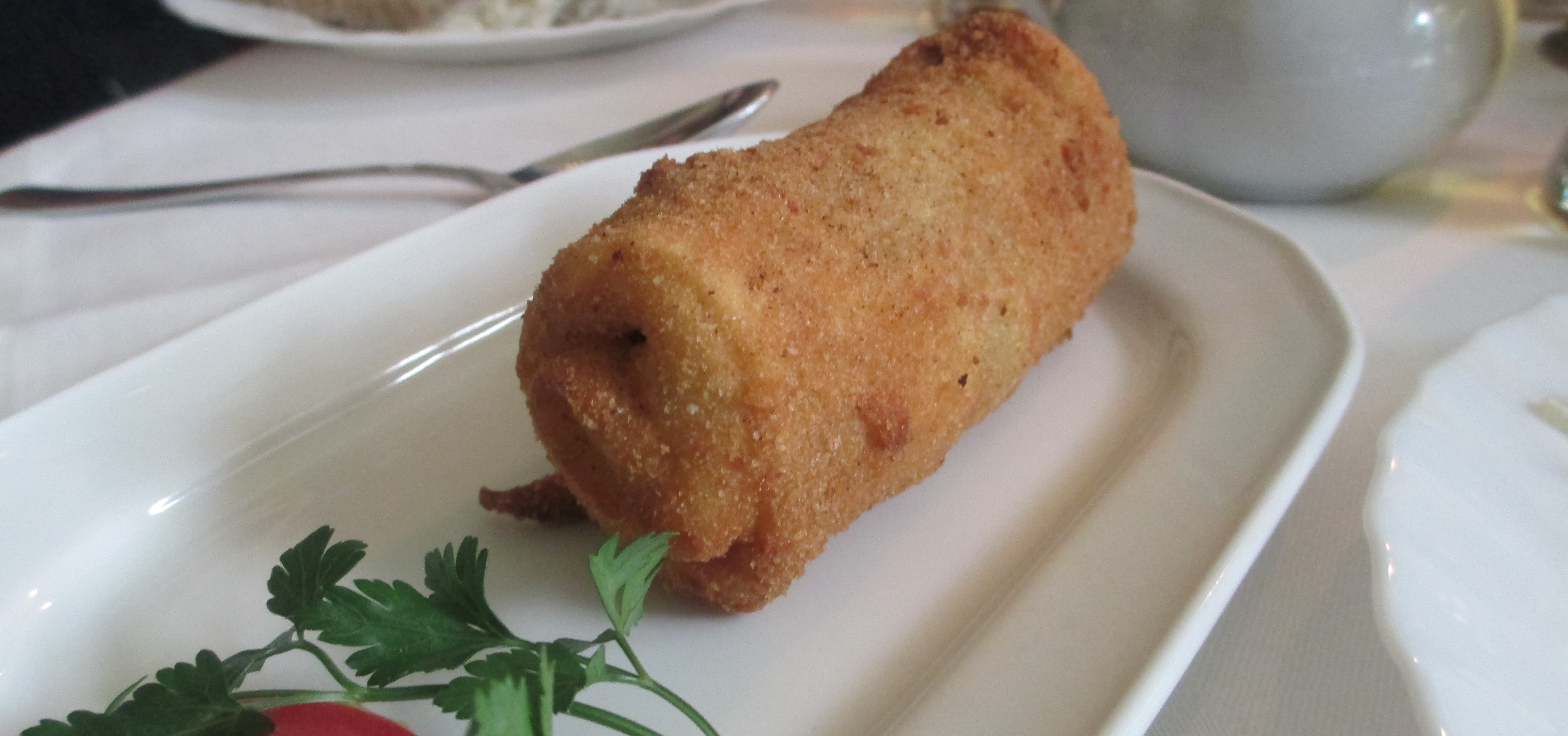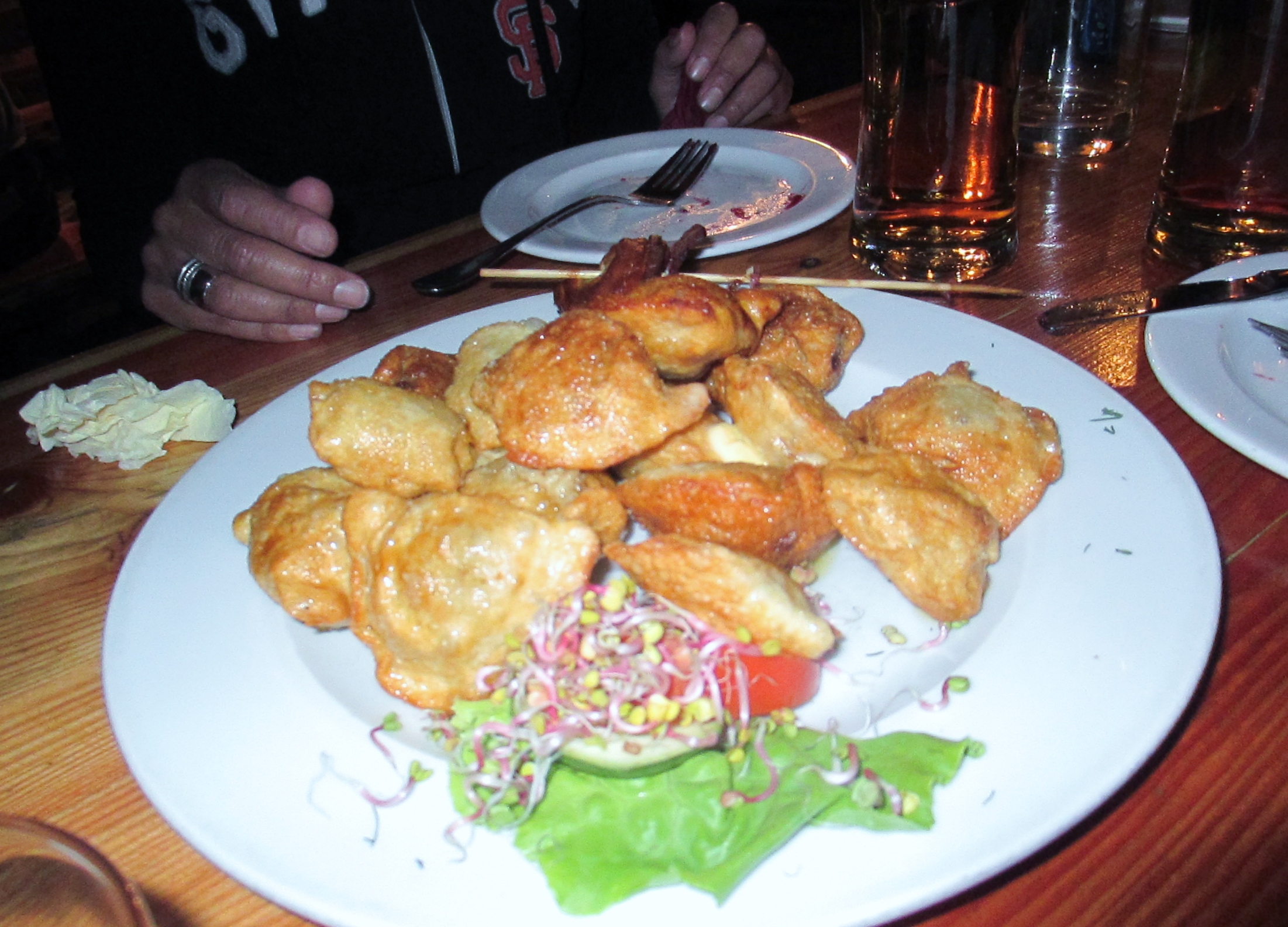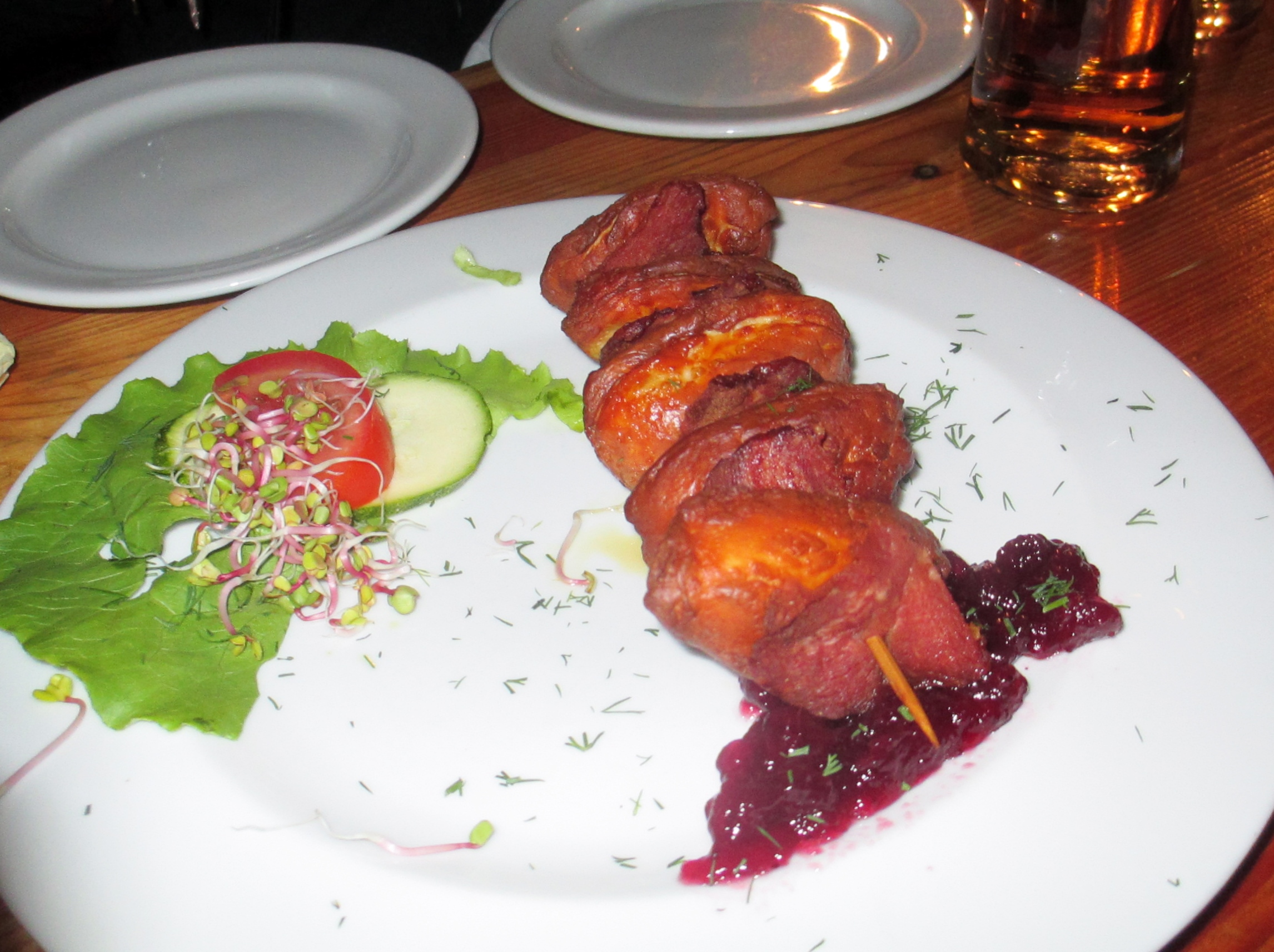 U Babci had a menu equally enormous to that of Pod Baranem, which concluded with a list of song selections for on demand entertainment from the piano man. We placed our order and began to drink away our salt mine trauma as we waited. Soon, the ewe’s milk cheese fried with bacon arrived.