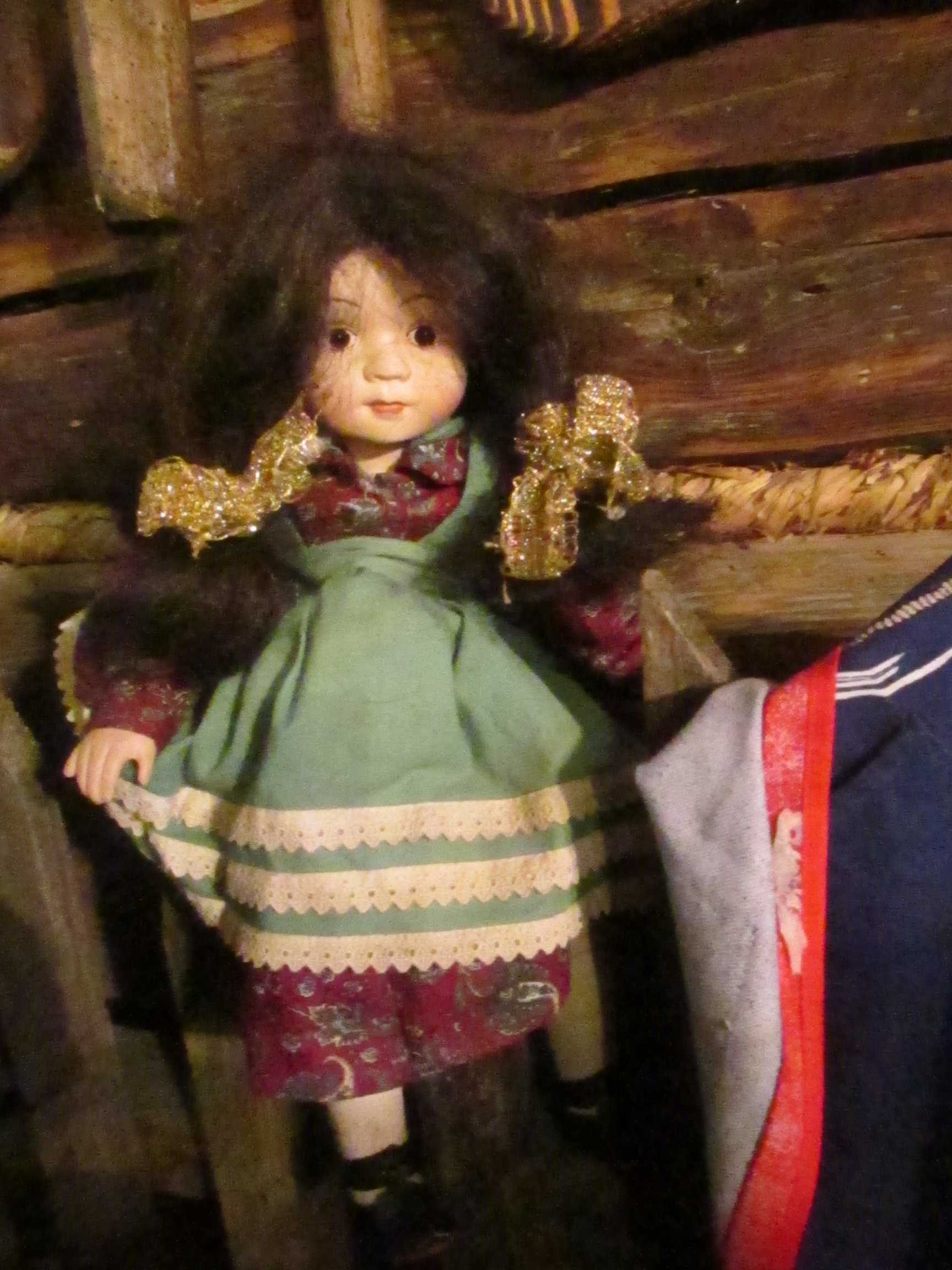 He led us downstairs where there were two completely opposite style dining rooms, side by side, separated only by an archway. One, fussy and doily laden, truly evoking thoughts of grandmothers and their sitting rooms the world over,(complete with piano player) the other, a cozy, dark, den outfitted with picnic tables. We requested a table in the latter; a room decorated with all manner of creepy porcelain dolls and western gear (saddles, etc.) with its own little bar and an all female wait staff, dressed in white lace dresses, black 1920’s style jewelry, with feathers and/or headbands in their hair.