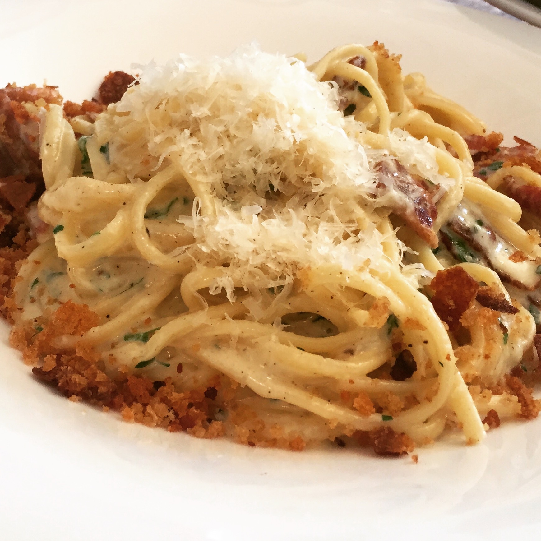 They usually have three to four linguine’s from which to choose, carbonara, pesto, and vongole being the usual suspects in the daytime rotation. I’ve devoured two of the aforementioned three, both of which were magnificent.The carbonara was an intensely decadent version, not classically made with a simple egg coating, but loaded with cream and flecked with enormous, salty, satisfying hunks of bacon, the entire mess topped with nutty bread crumbs and a pile of pungent cheese.