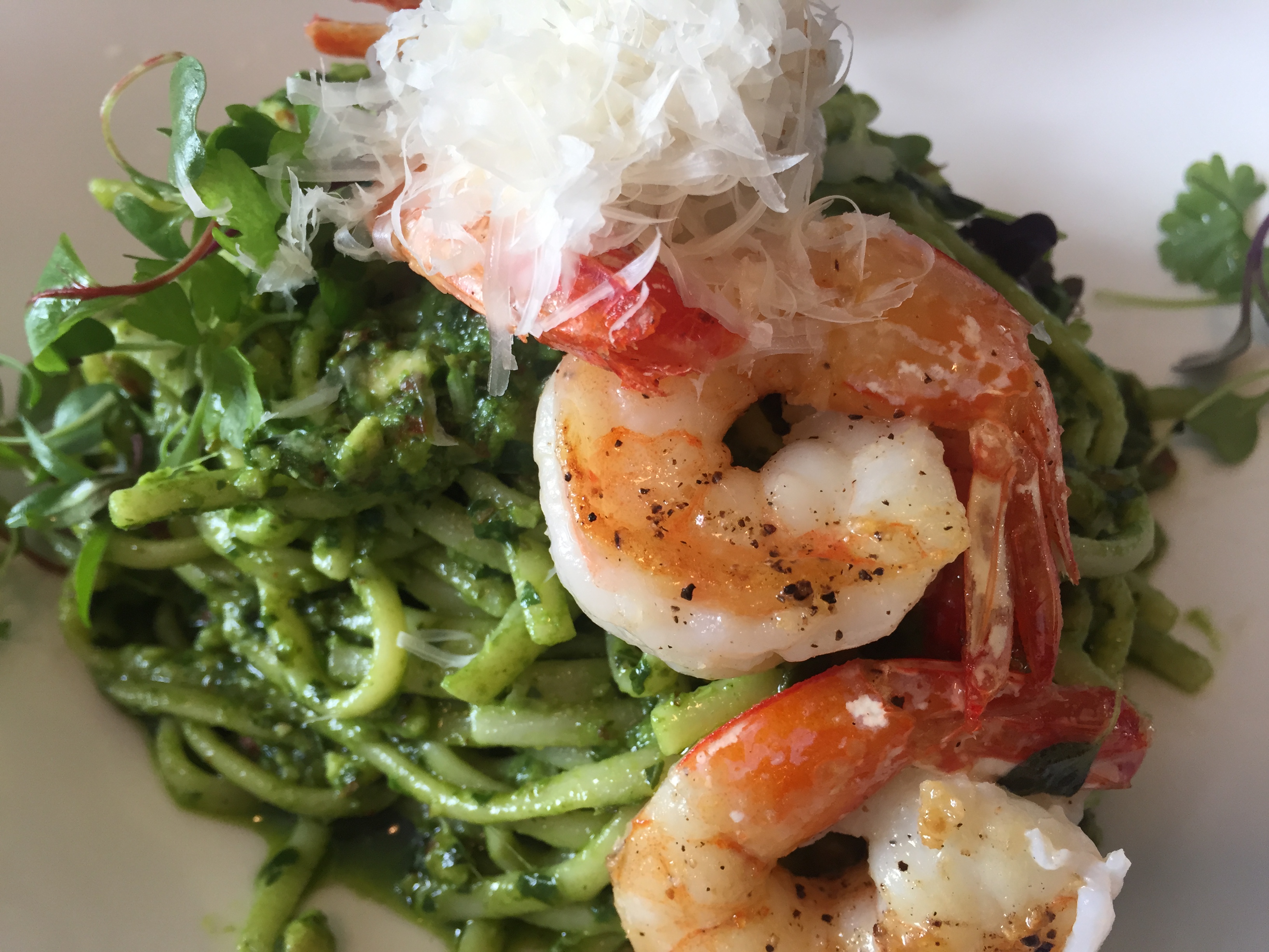 The pesto was AMAZE. Pesto sucks so often that I rarely order it, wincing with displeasure when it shows up all oily, loose, and weak flavored. This pesto was tight, vibrant, and heady with rich, crunchy, almonds as opposed to the traditional, more lightly flavored pine nut. It was served with juicy, perfectly seasoned, grilled gulf prawns.
