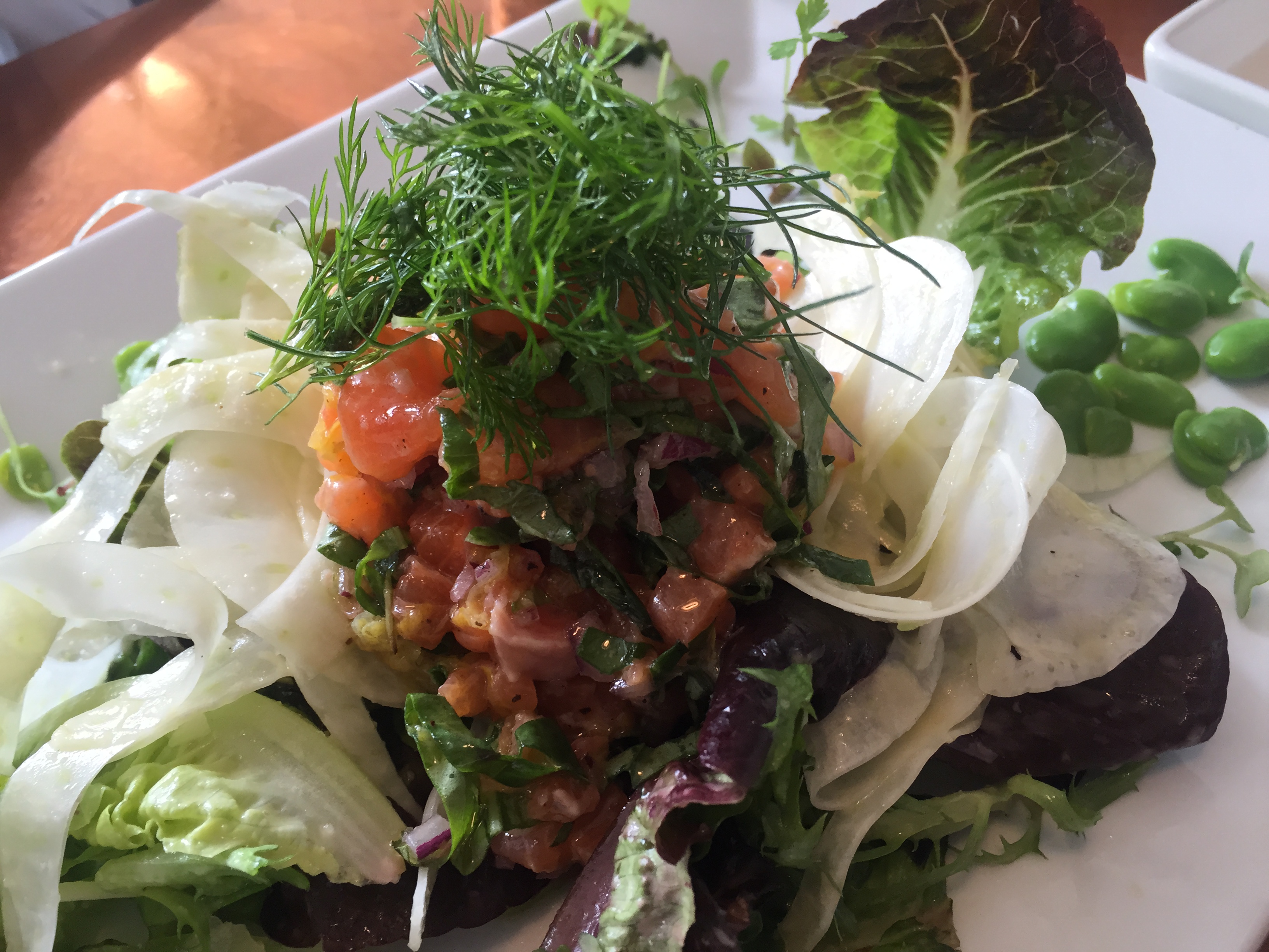 A rich and luscious mound of cubed red meat trout surrounded by brightly dressed, delicate lettuces, fennel, and, an early spring favorite of mine, fava beans.