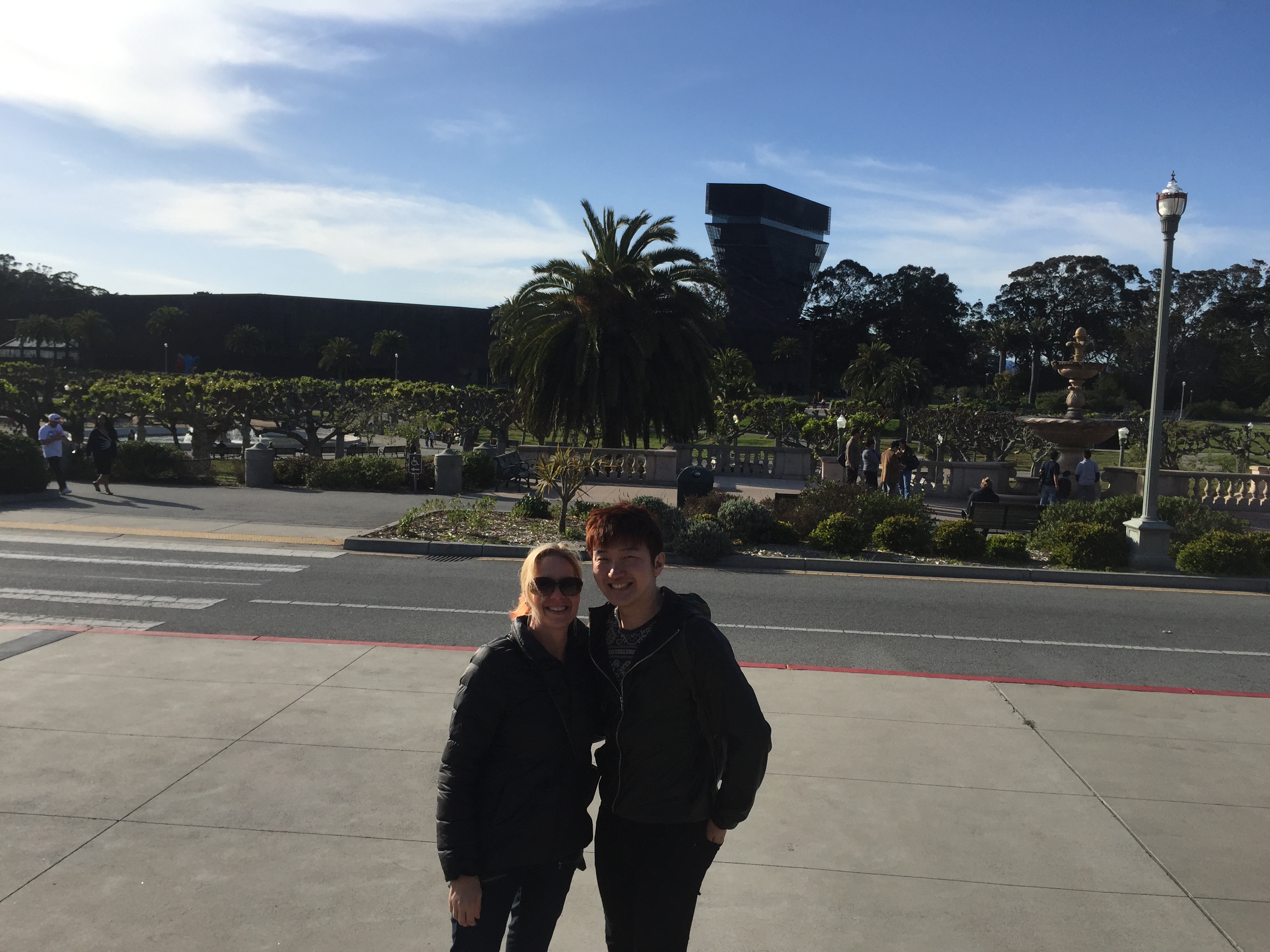 Tickets are $12 online for non-members, $10 for members (added bonus, members get their own dedicated entrance). Parking can be a challenge, though we had no trouble that night, it’s best to take public transportation if possible. By our 5:30 arrival time, there was already a line about two blocks long, which left ample time for Jae-Min to explore the music concourse (which is behind us in the photo below) full of statues, trees, fountains, and a Romanesque stage, oddly named the “Spreckels Temple of Music.” The big triangular building in the back of the shot is the De Young Museum; I’m told the view from the observation deck is spectacular.