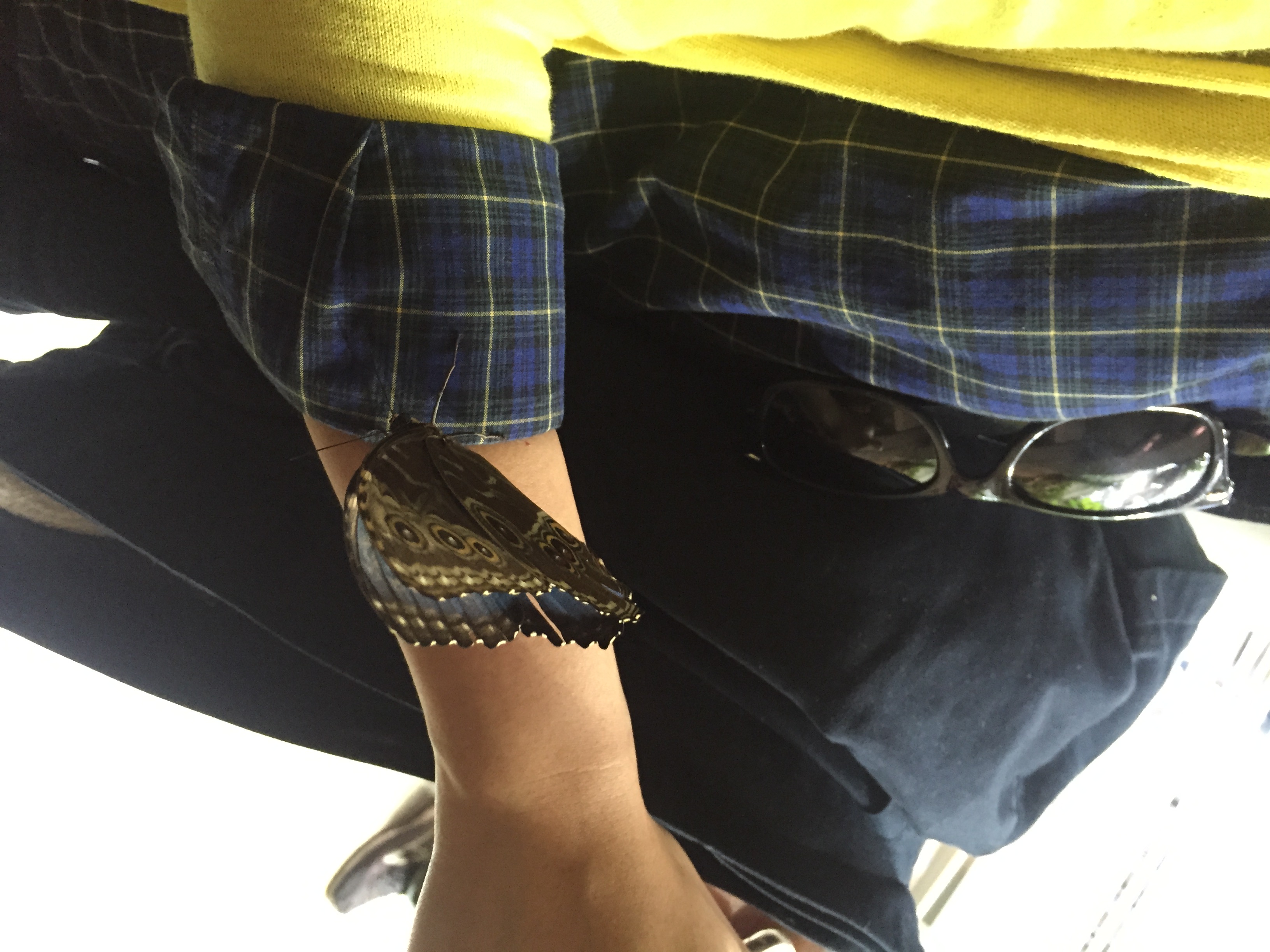 A spiral walkway takes visitors up through the different ecosystems in 82 degree heat, with 75 percent humidity. Beautiful birds fly across the dome freely, fish move lazily through the water below, and butterflies flutter about, occasionally landing on people, as this lovely creature did.