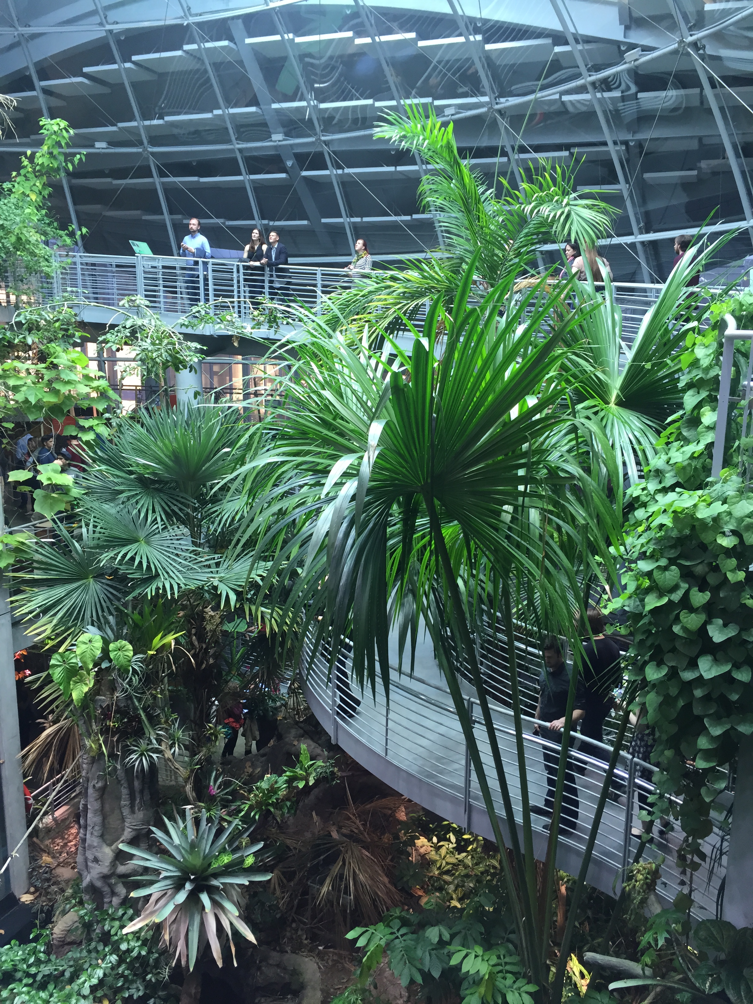 We finished our mules and got in line for the Osher rainforest dome, an exhibit which should be visited at the first available opportunity, because it closes earlier than the others; also, there can be a lengthy wait, as they let people in in groups. The dome is an extraordinary 90 foot diameter glass enclosure, encapsulating three different rainforest ecosystems (Bornean on the bottom, Madagascan in the middle, Costa Rican at the top), with a 100,000 gallon tank as its foundation; the Amazonian flooded forest, which can be viewed both from above and below, via a translucent tunnel.
