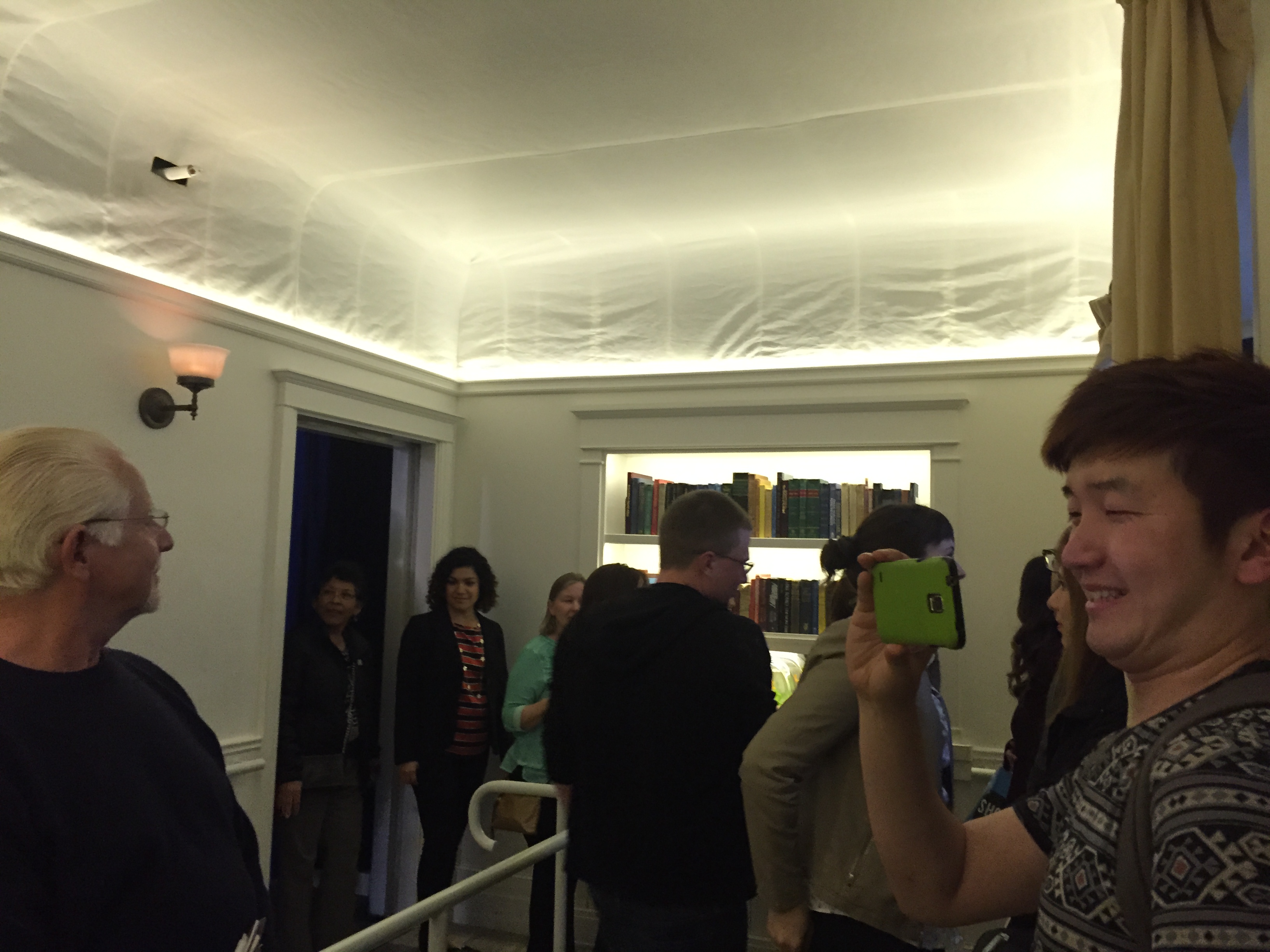 The live action part of the earthquake exhibit, the simulator, is set inside a dome of sorts. First, there is a small room where a brief film about tectonic plates and the like is shown. Next, the group is moved into a room that is staged to look like it’s in a home or apartment in San Francisco, down to the ceiling rosette.