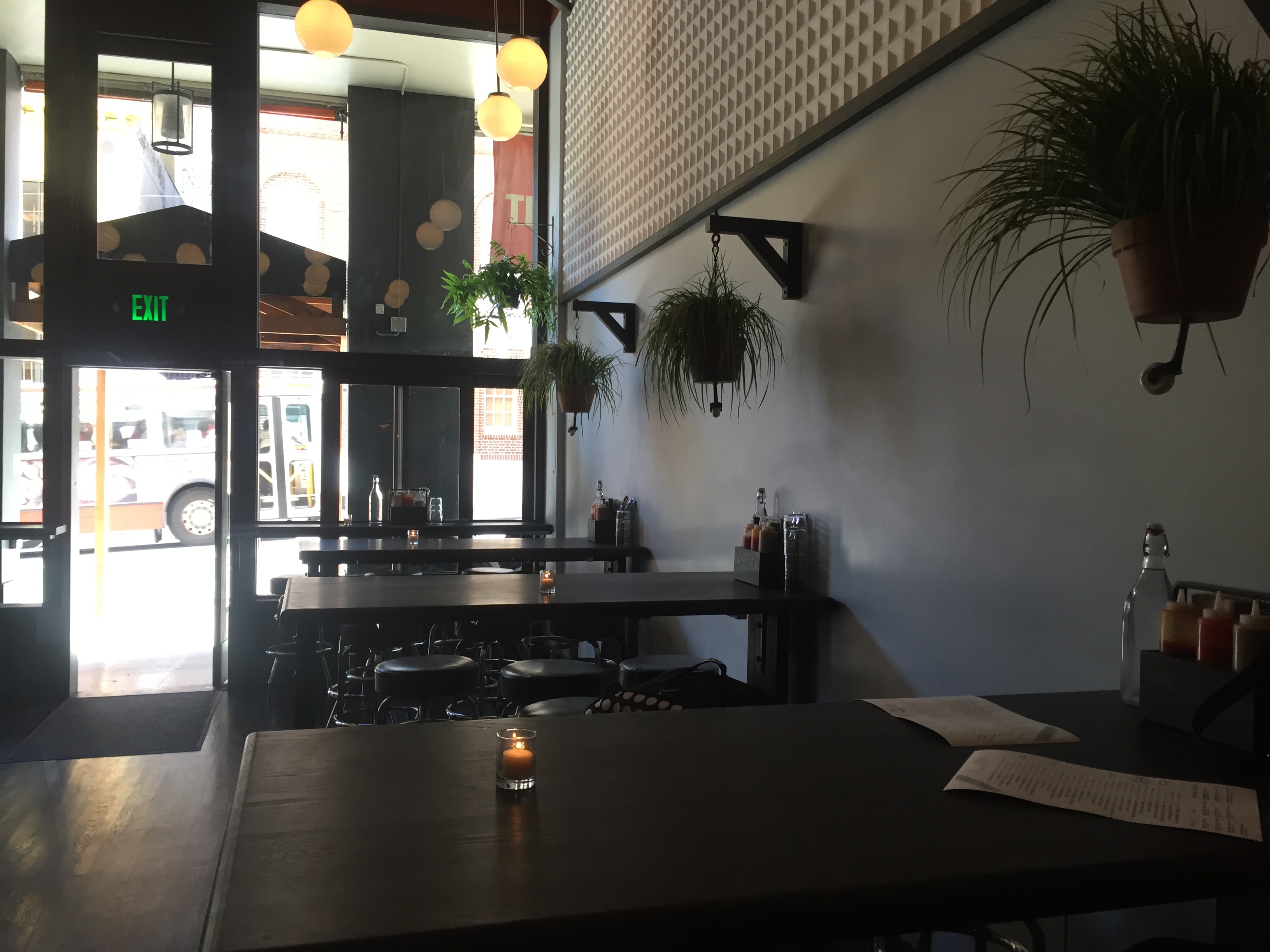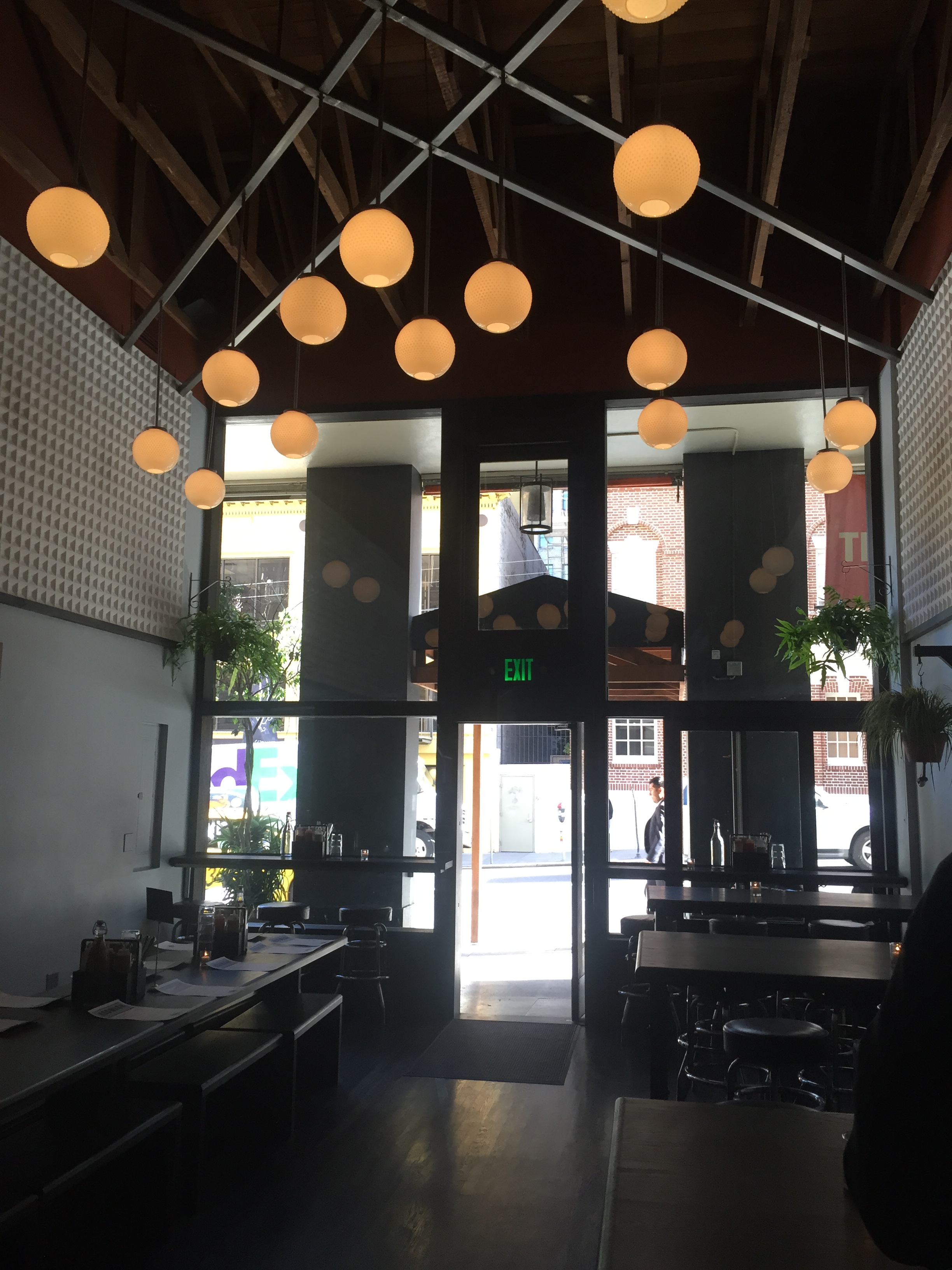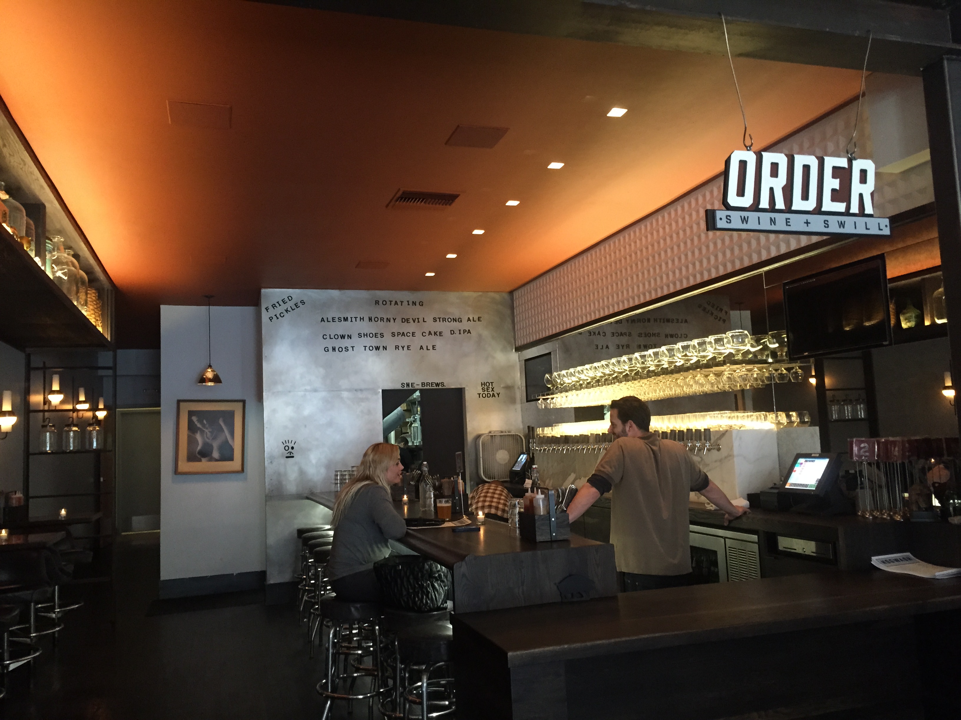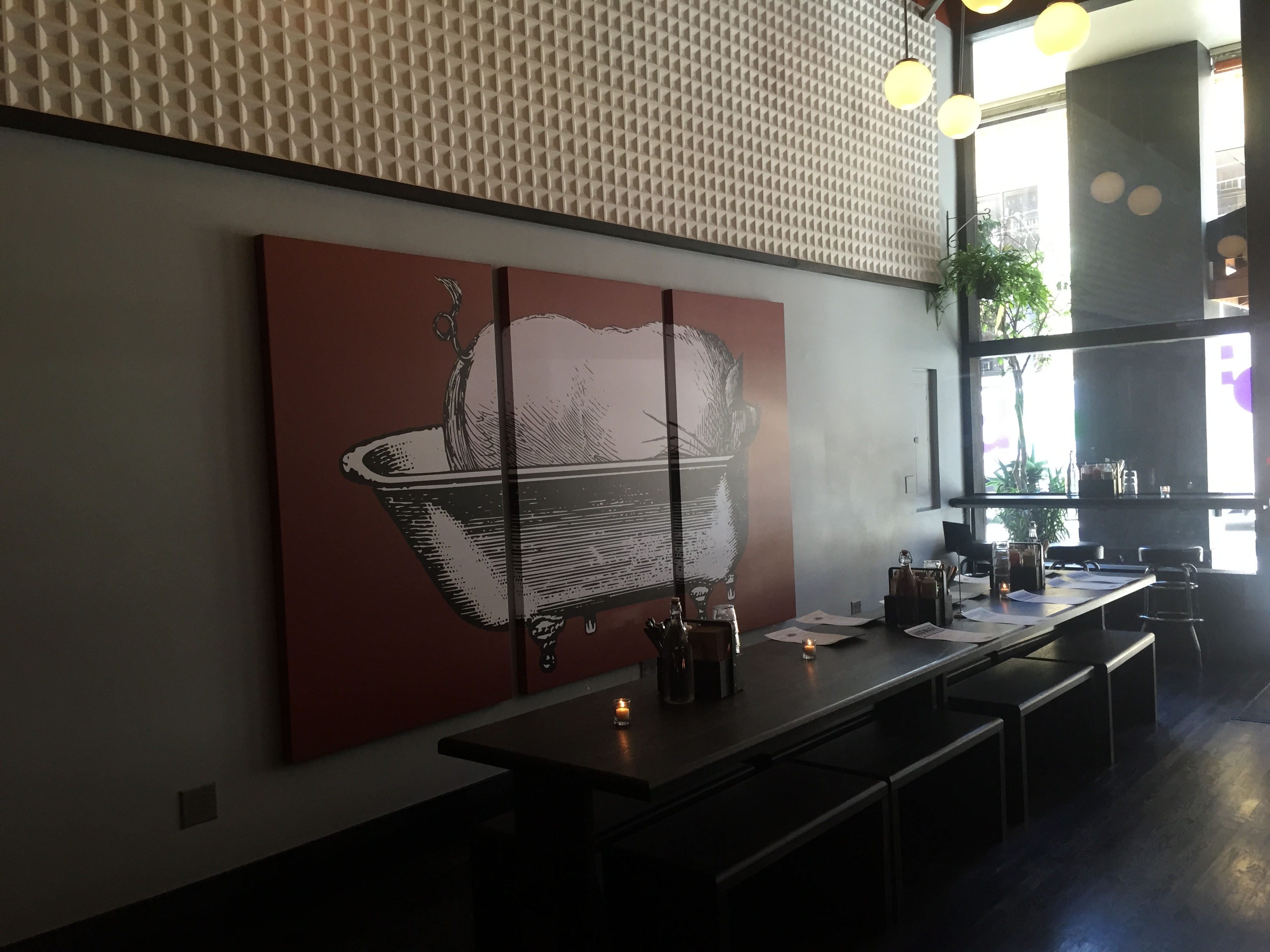 Overall, Hogwash has a modern, clean, smartly designed feel; the view from back to front is particularly appealing, with a full scope of the front room topped by a sort of geometric bubble bulb “chandelier”