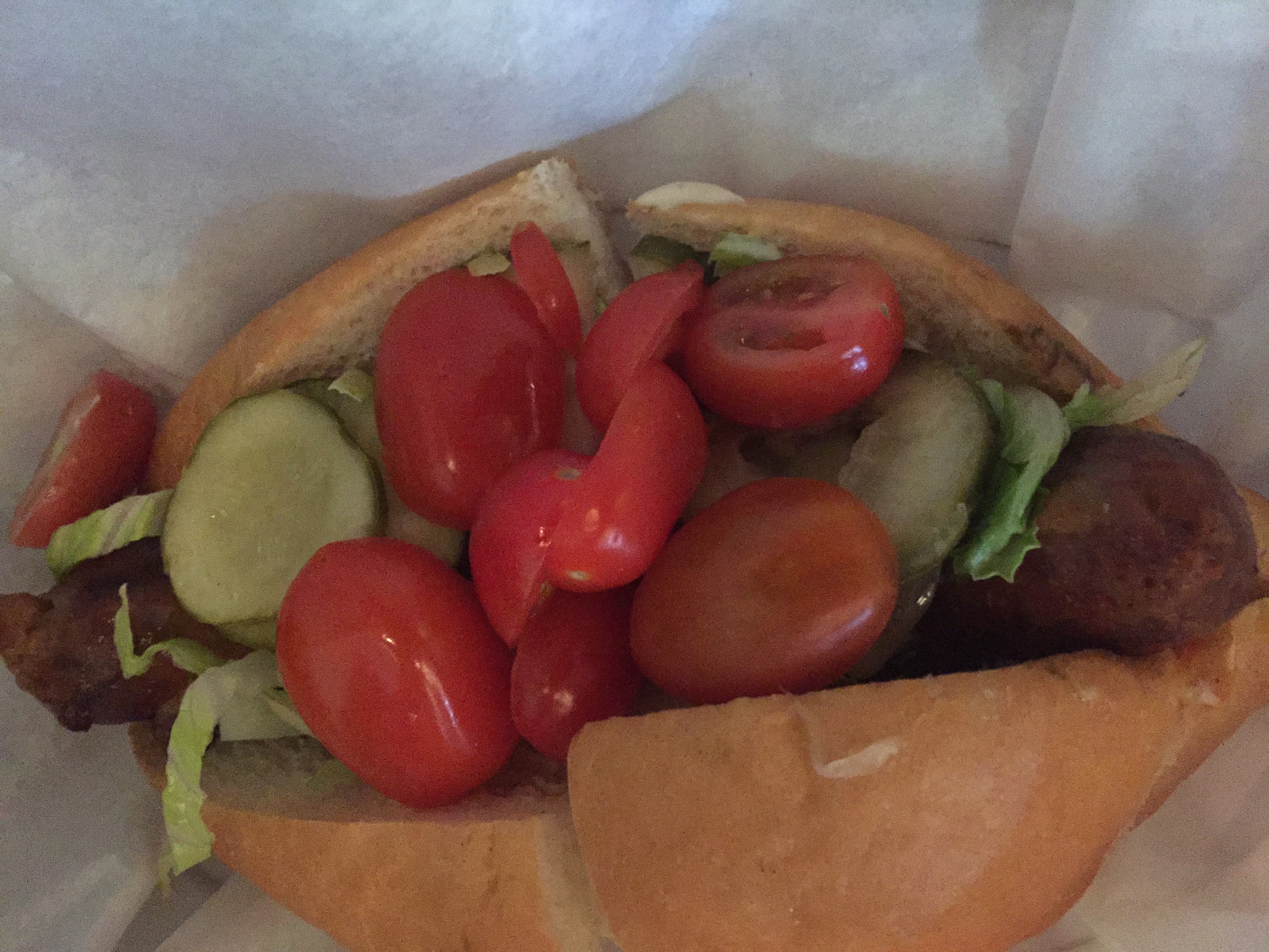 The Abe Froman, a beef and cheddar sausage with thousand island, tomatoes, and lettuce, a straightforward and tasty combo, housed in a nice soft roll