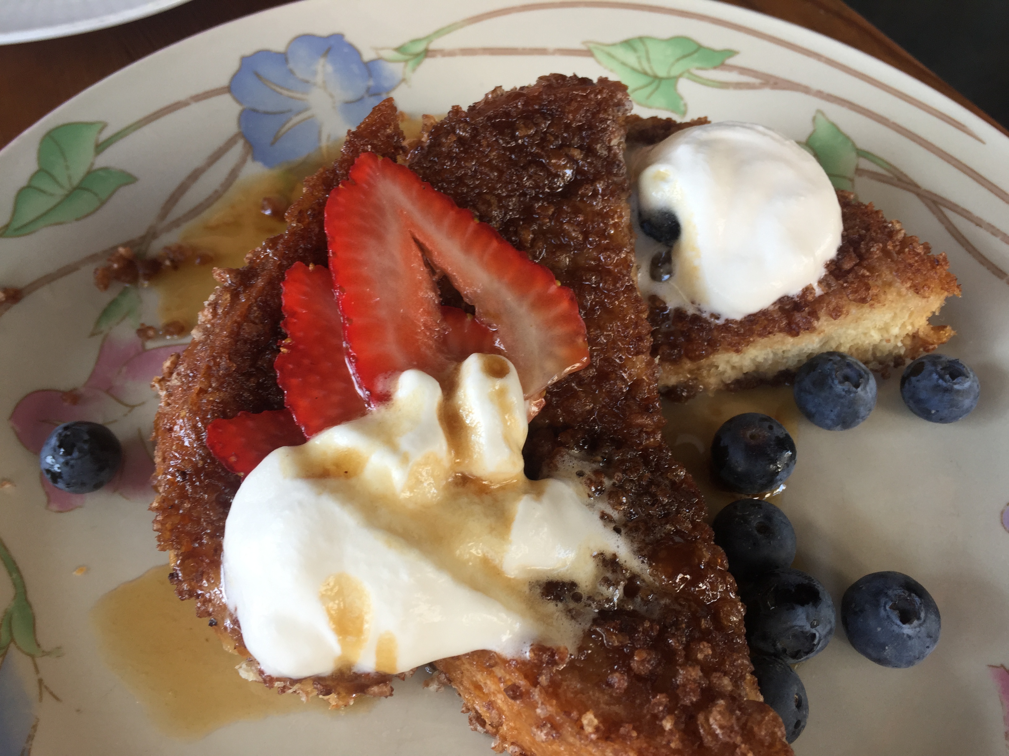 An order of brioche french toast with blueberries, strawberries, mascarpone, and a spiced maple reduction