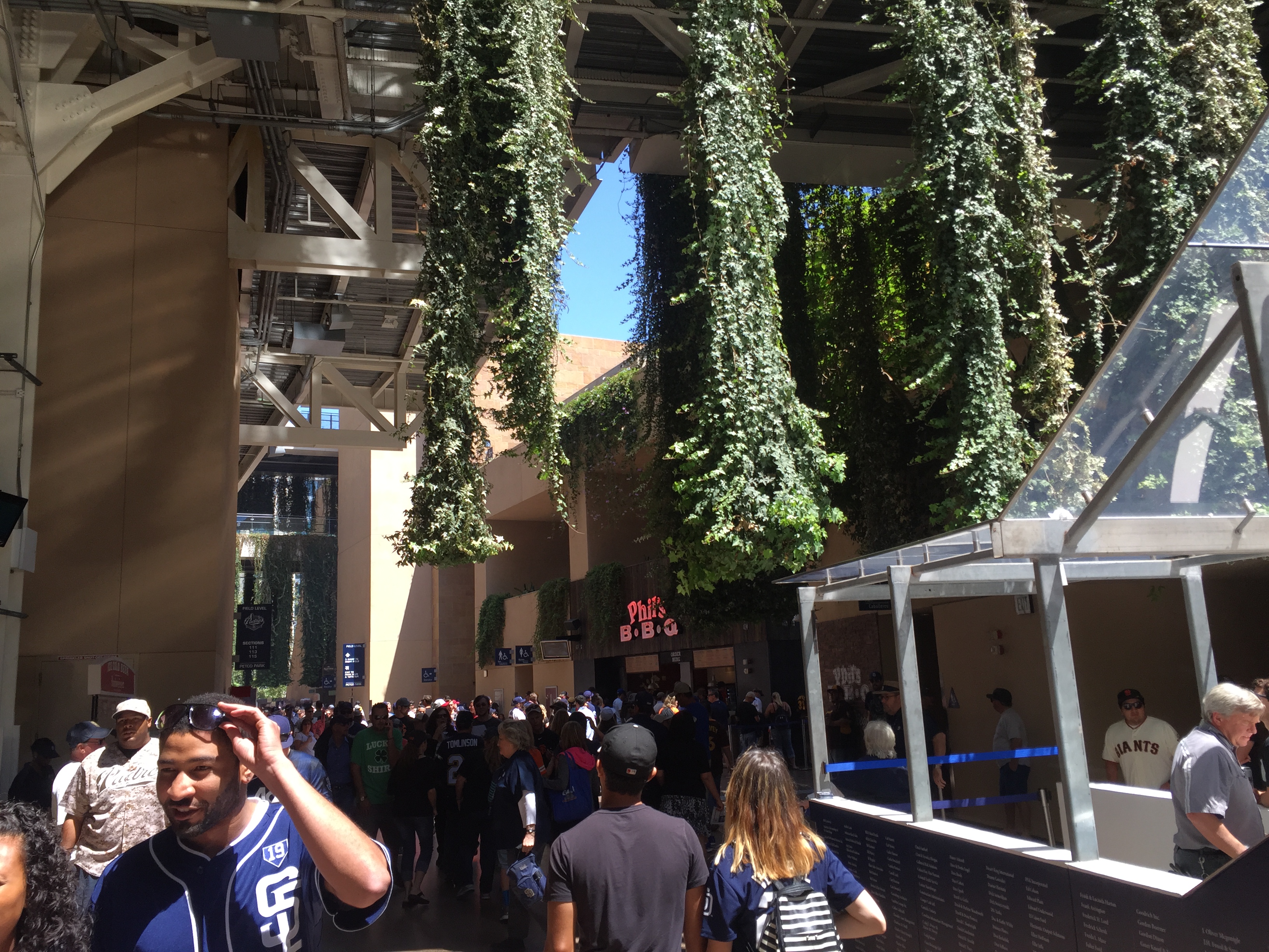 Inside Petco park, the walk to our seats took us along an open air, mostly uncovered promenade that wraps the perimeter of the park, giving it an entirely summery feel, which as Giants fans who are subject to the wrath of Karl the Fog at any given moment, was a delightful revelation. Green ivy columns hung from walkways above; a far cry from the grey concrete hallways that line AT&T or the Colleseum.