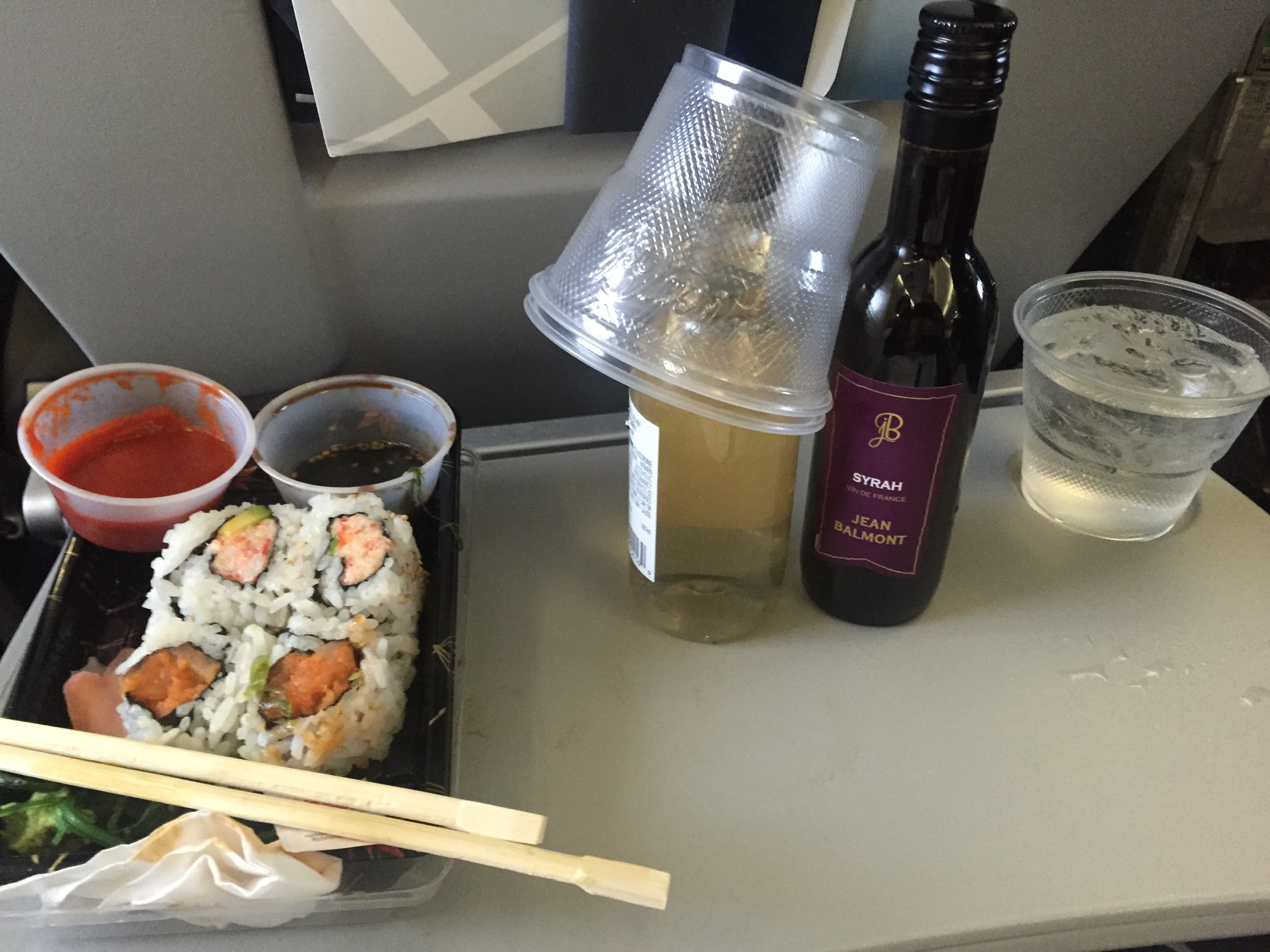 Ah, the bliss that comes with not eating a $9.00 box of “tapas.” Also, sushi and wine. If United actually supplied in flight entertainment at no cost, this would have been a truly pleasant flight experience.